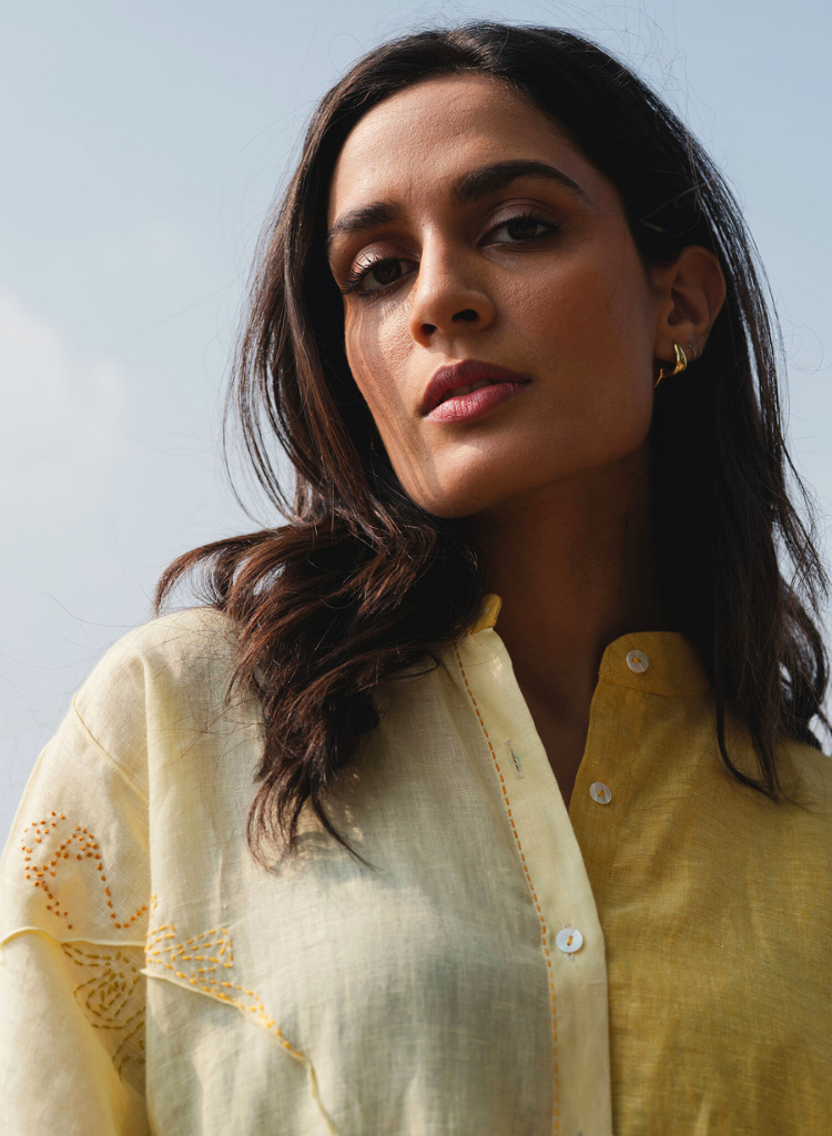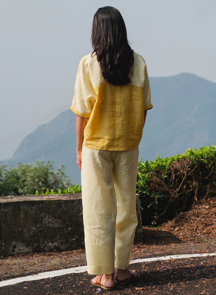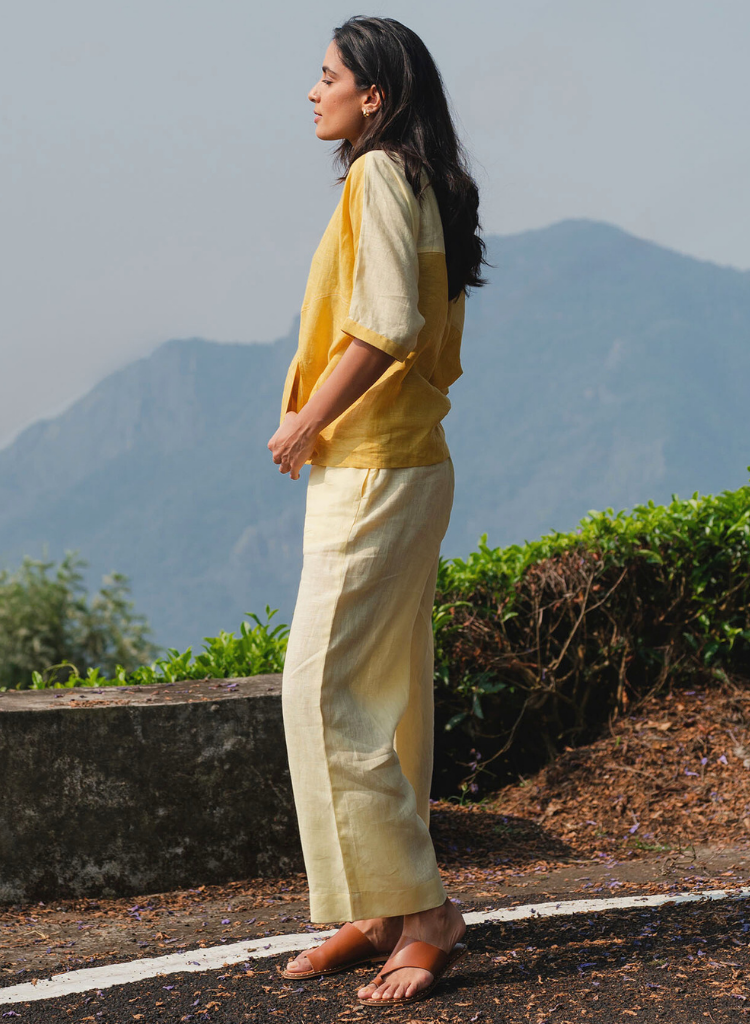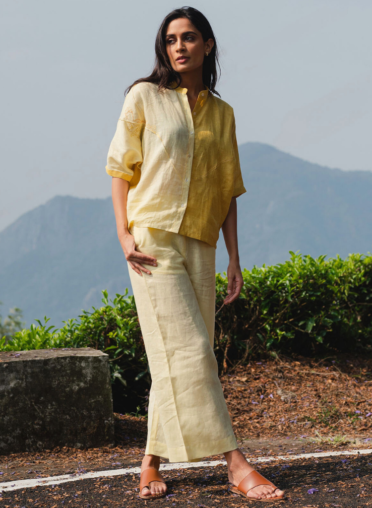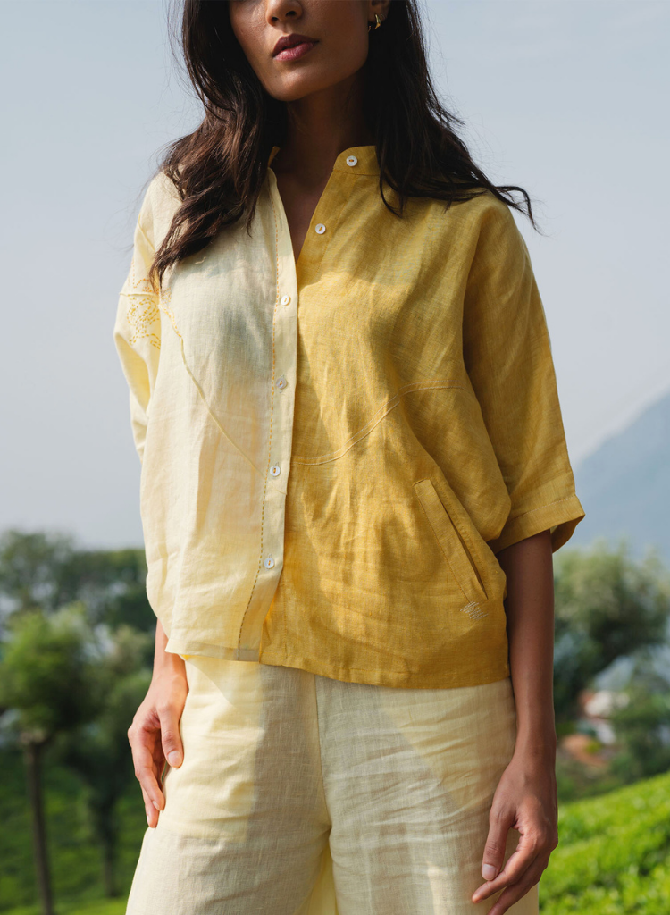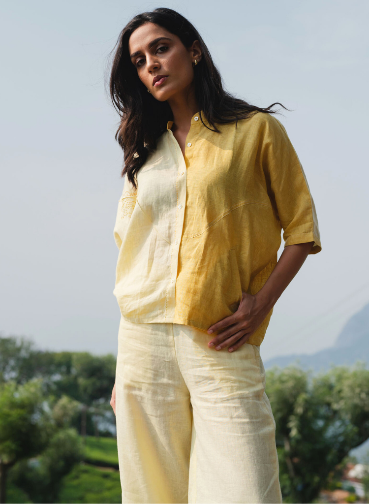 A two-piece set pairing a boxy shirt and a straight-cut pants. The dual-tone shirt features intricate embroidery on one side, a band collar, 3/4th sleeves and an inseam pocket. Length 24.5". The pants feature soft butter yellow hue and inseam pockets. Length 38". The model is 5'6" and is wearing size S.