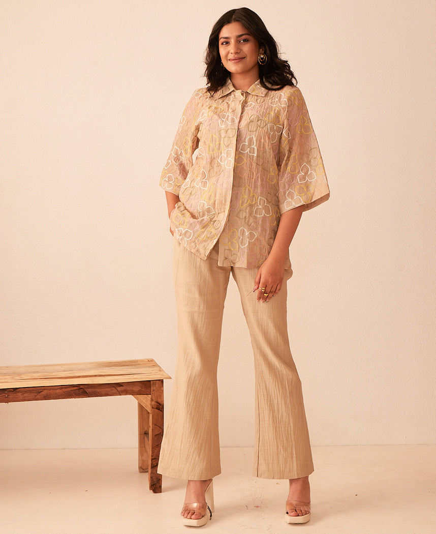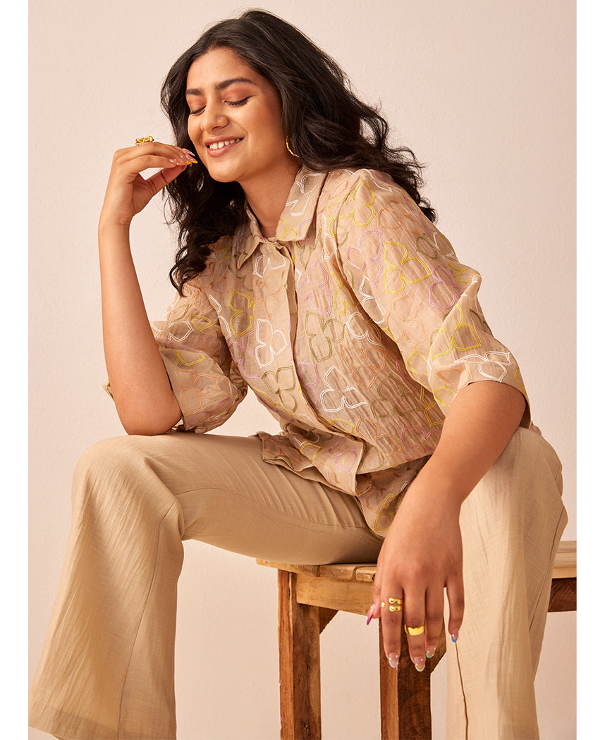 A boxy shirt with pastel floral hand embroidery. Features kimono sleeves, a classic collar and a concealed front placket. Length 28". The model is 5'8", and is wearing size M.