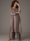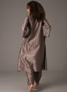 A two-piece set pairing the Greige Embroidery Dress and matching pants. The relaxed fitting midi dress with embroidery details features a round neck with a front button placket and inseam pockets. Length 46". Comes with a slip. The matching pants with a side slits feature an elasticated waist and inseam pockets. Length 38". The model is 5'8" and is wearing a size S.
