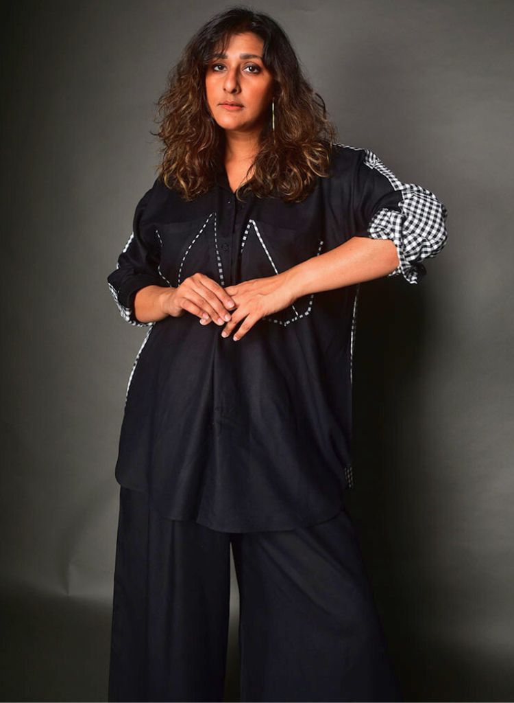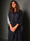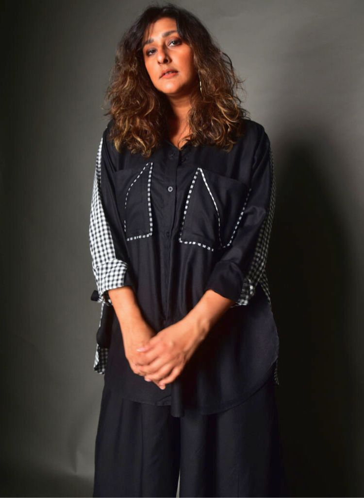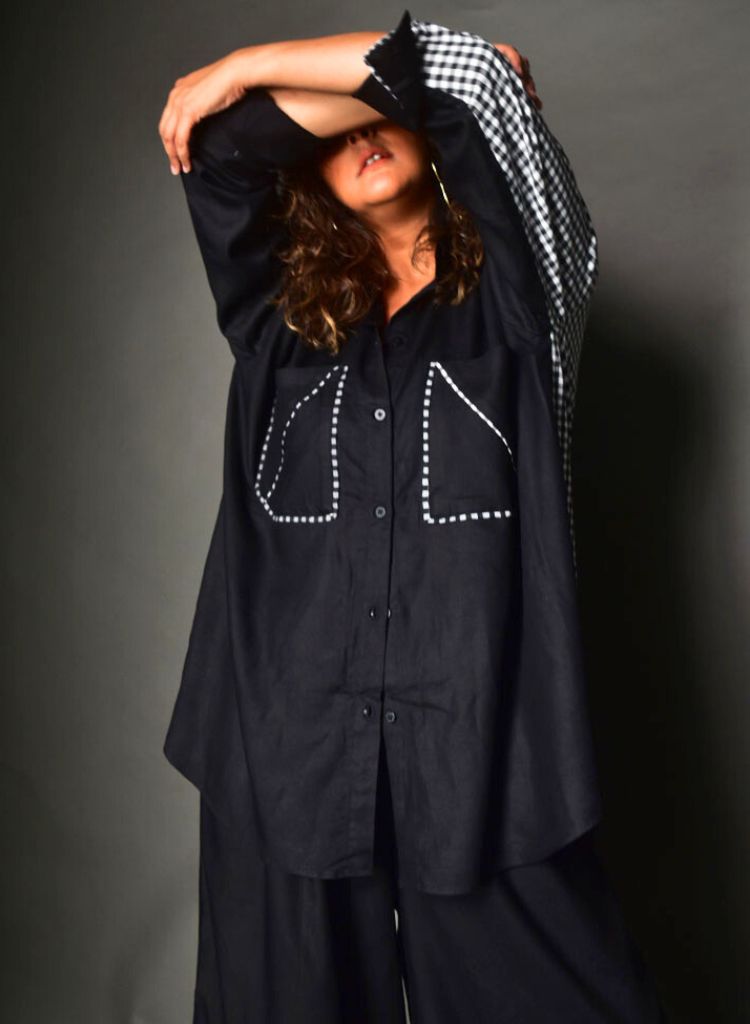 A relaxed-fitting shirt featuring a front button placket and patch pockets. Length 29-31". The model is 5'6" and is wearing size M.