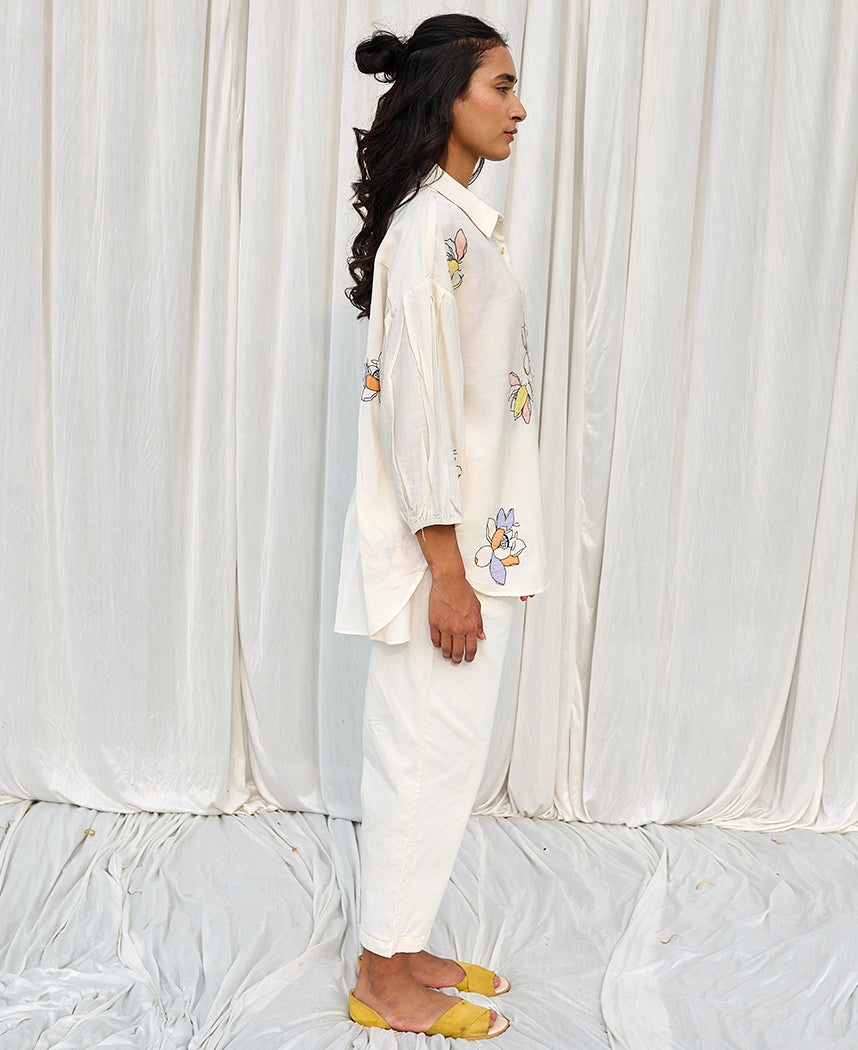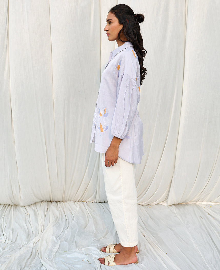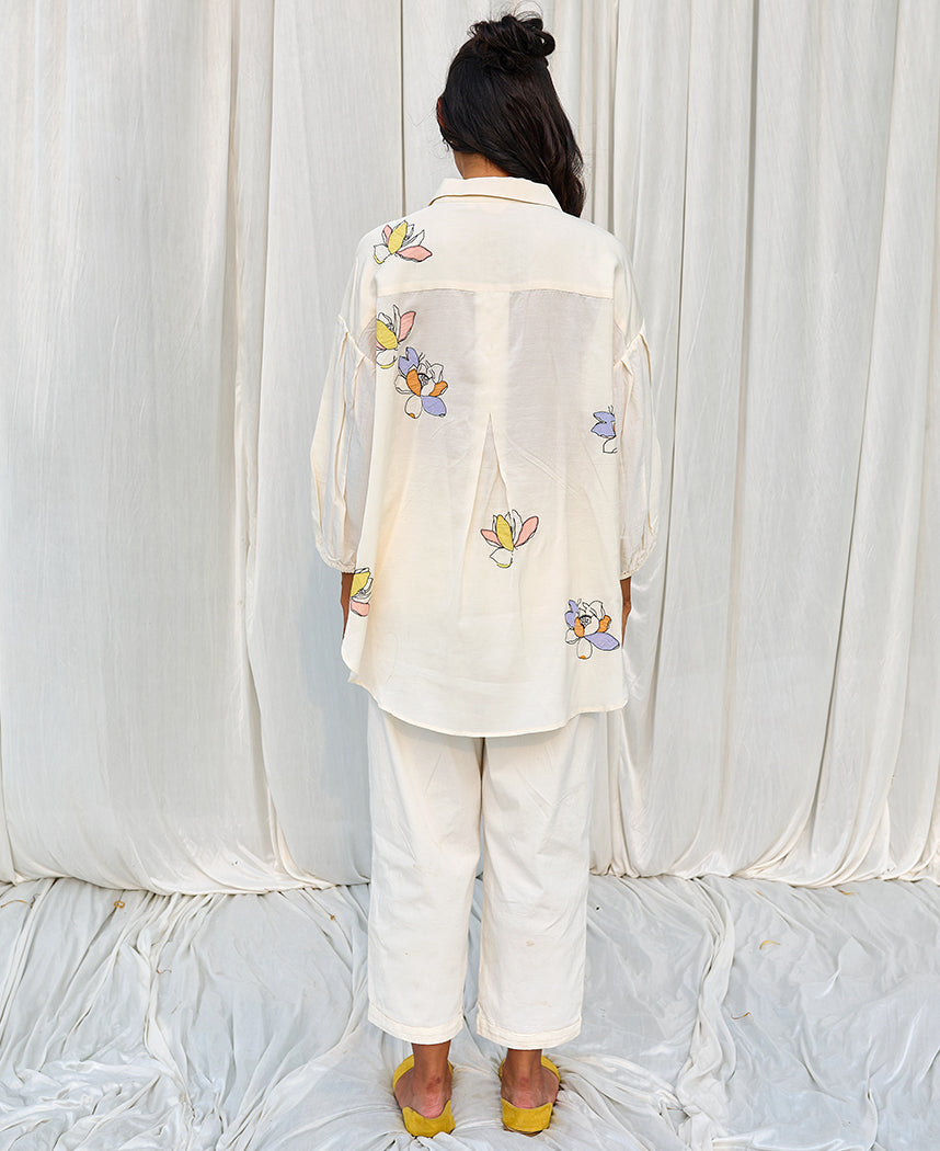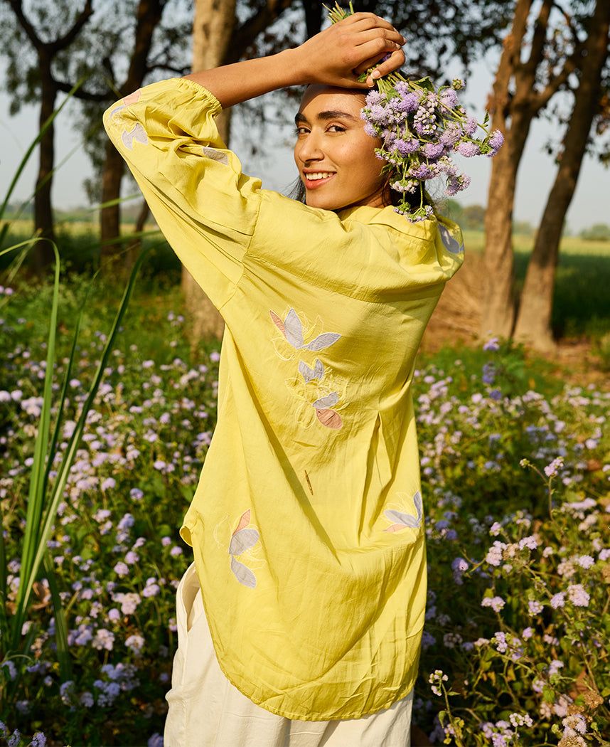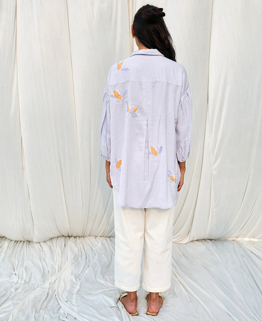 A long shirt with hand appliquéd flowers featuring a classic collar, a front button placket, elasticated sleeves and a curved hem. Length 26". The model is 5'7" and is wearing a size S.