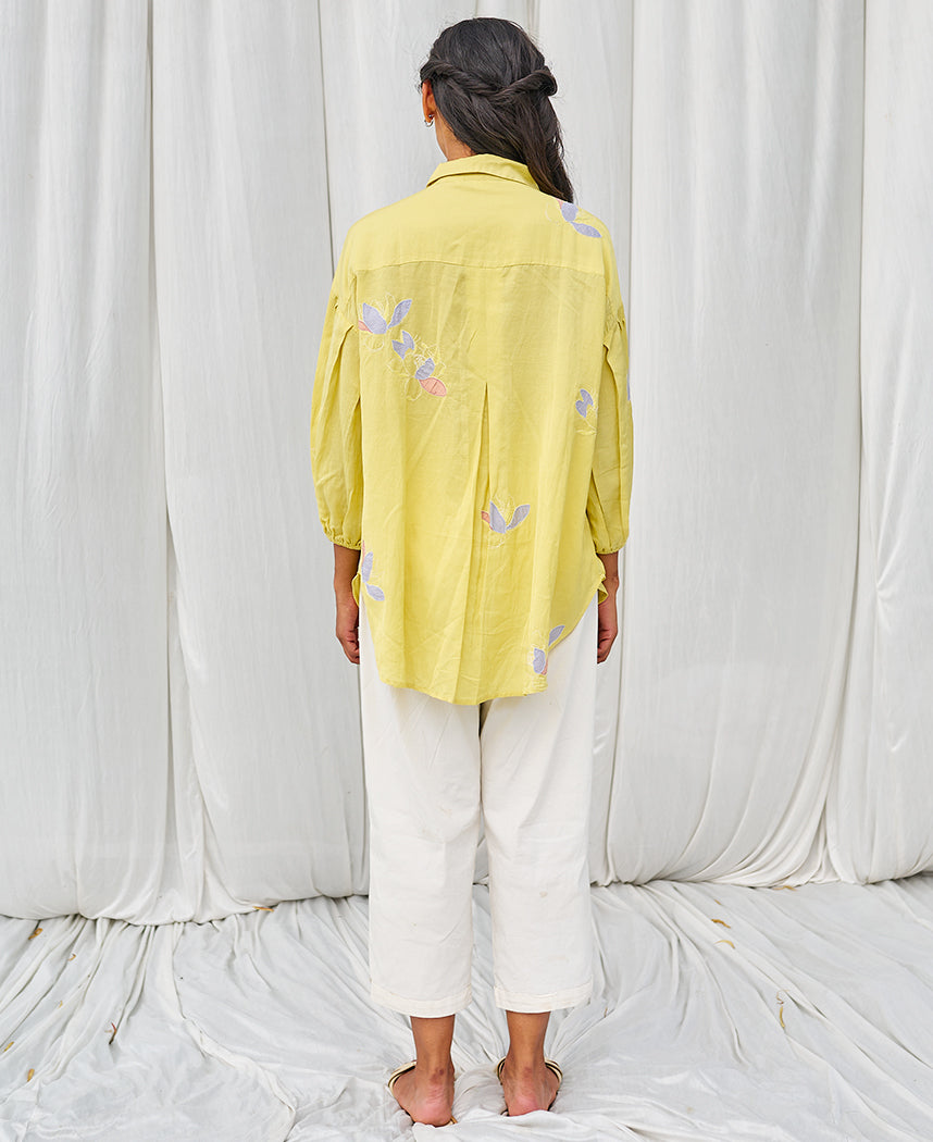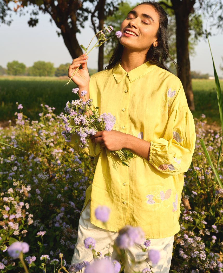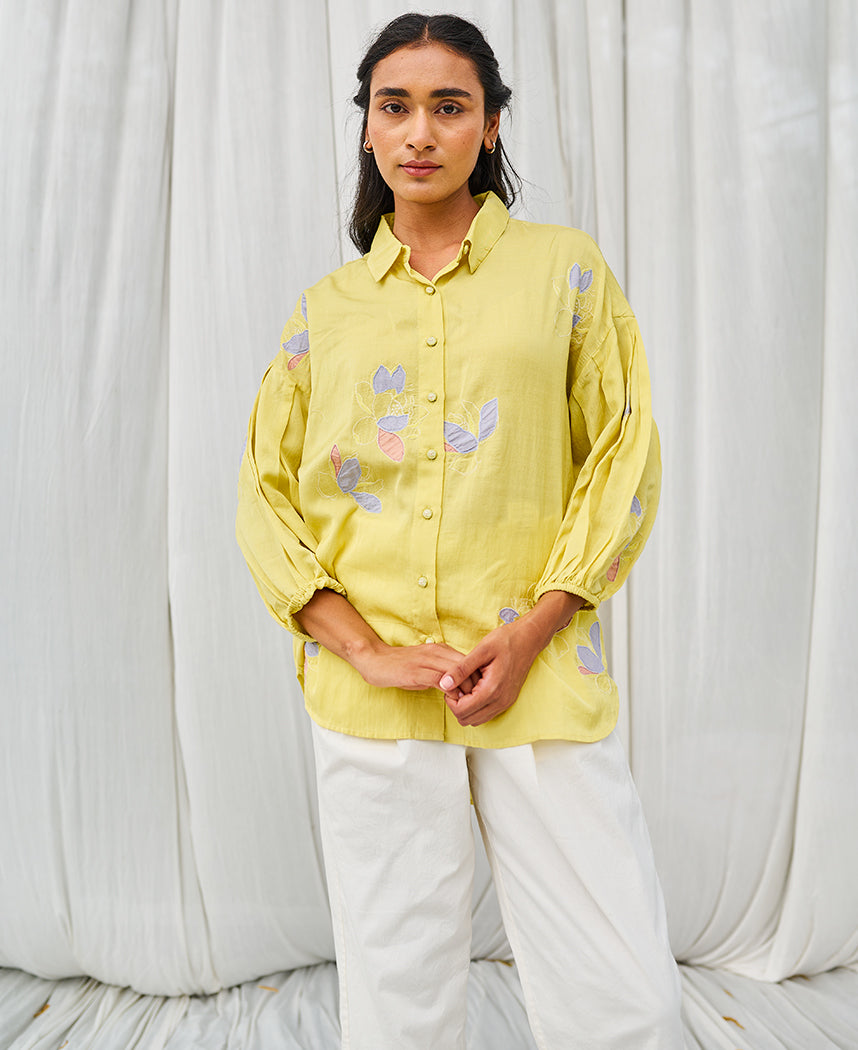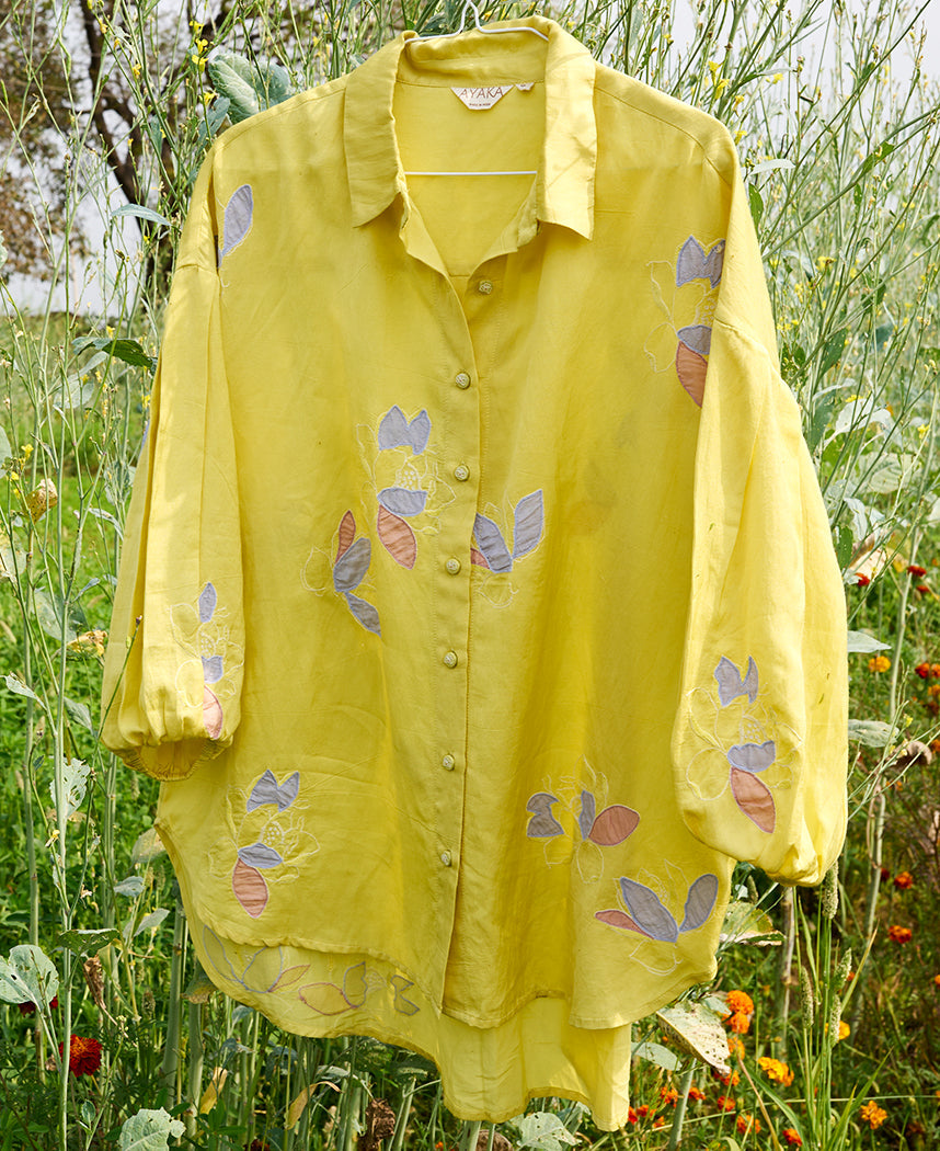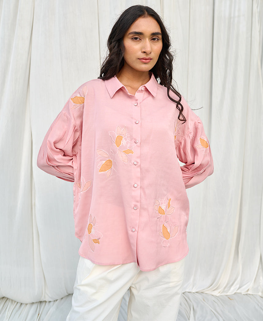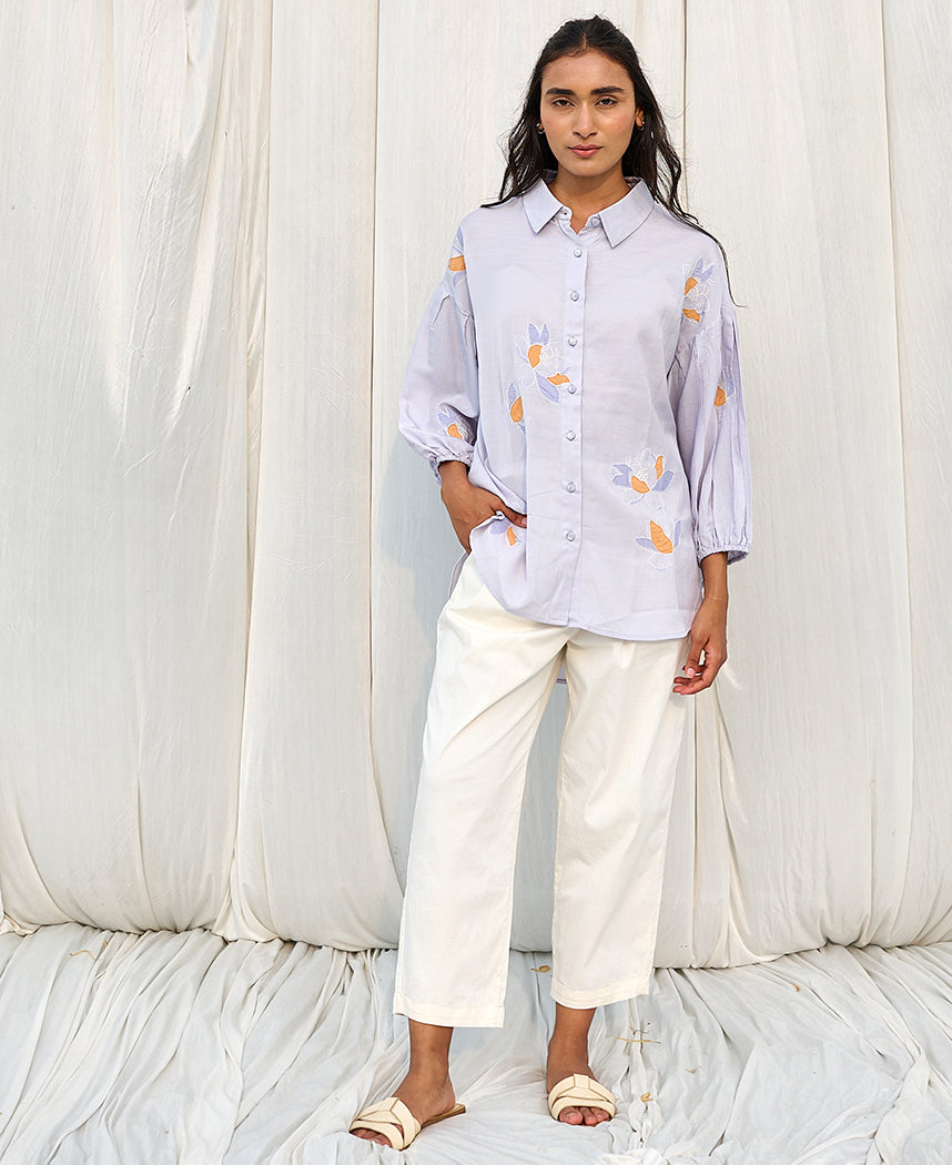 A long shirt with hand appliquéd flowers featuring a classic collar, a front button placket, elasticated sleeves and a curved hem. Length 26". The model is 5'7" and is wearing a size S.