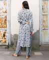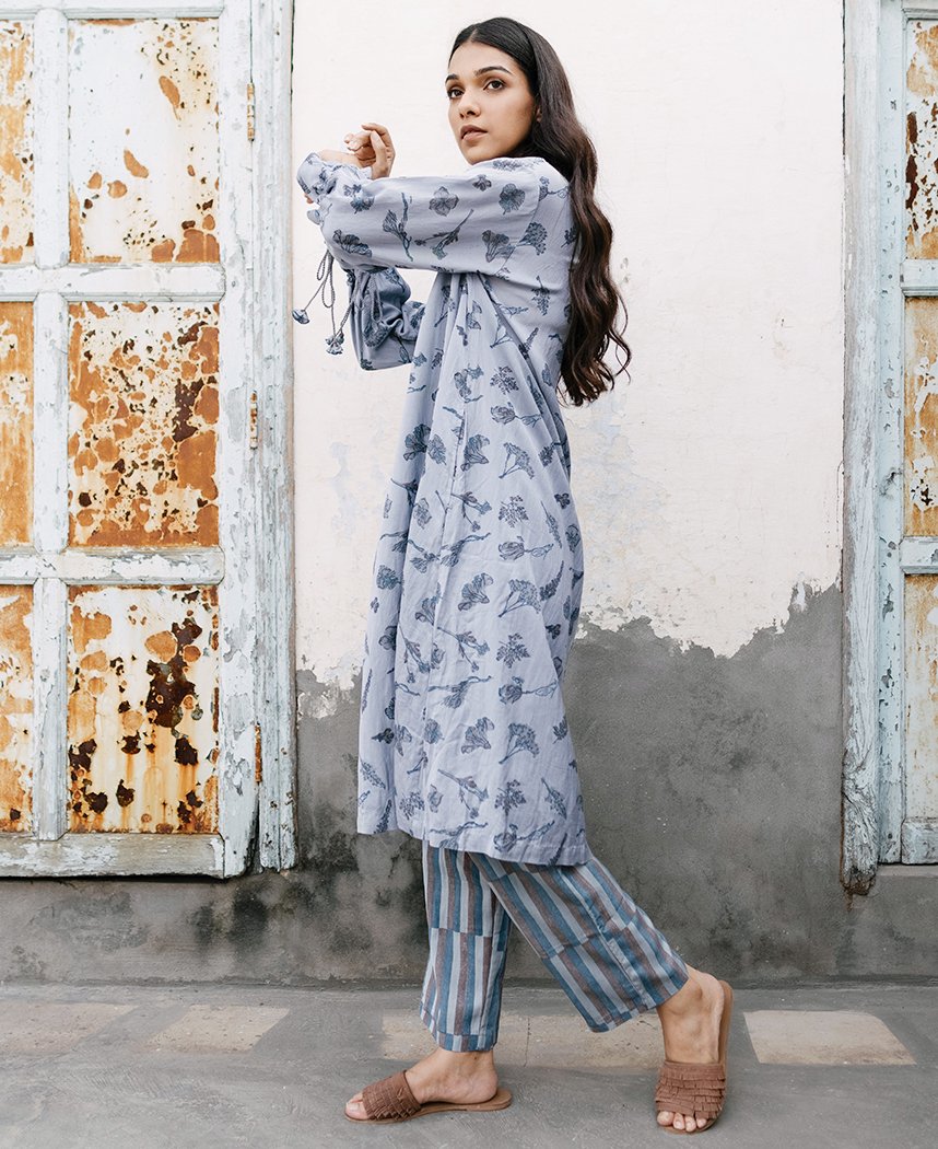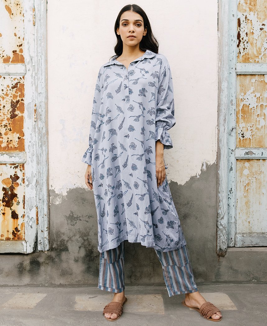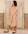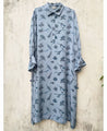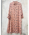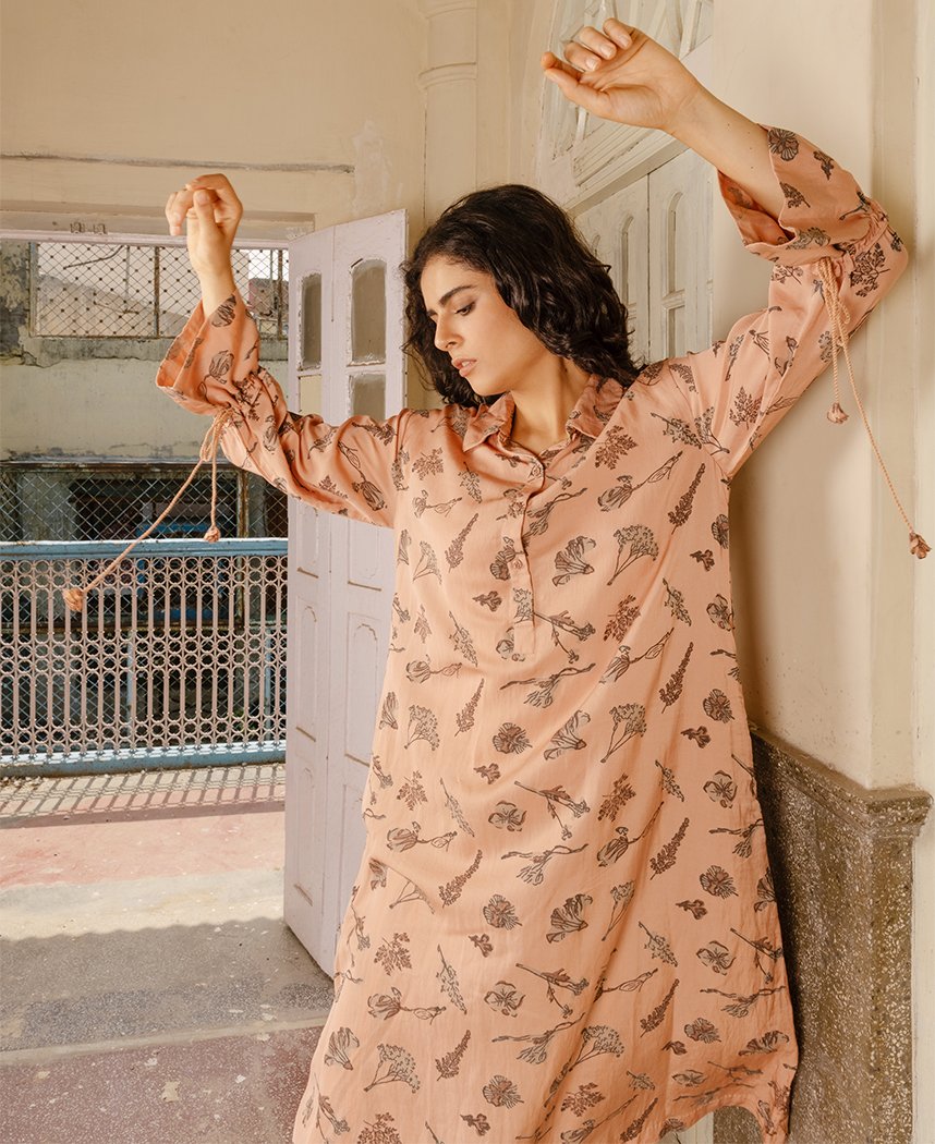 A relaxed A-line dress with hand-block printed flowers and tasseled drawstrings at the cuffs. Features a classic collar and front buttons. Length 43". The model is wearing a size S. Made in 100% organic soy fiber cotton.