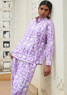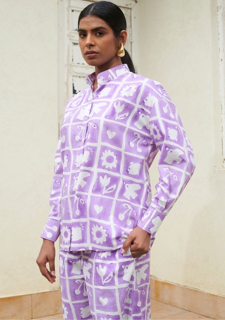A printed straight-fit shirt with drop shoulders and button-down opening featuring a band collar and long sleeves. Length 26.5”. The model is 6ft and is wearing a size S.