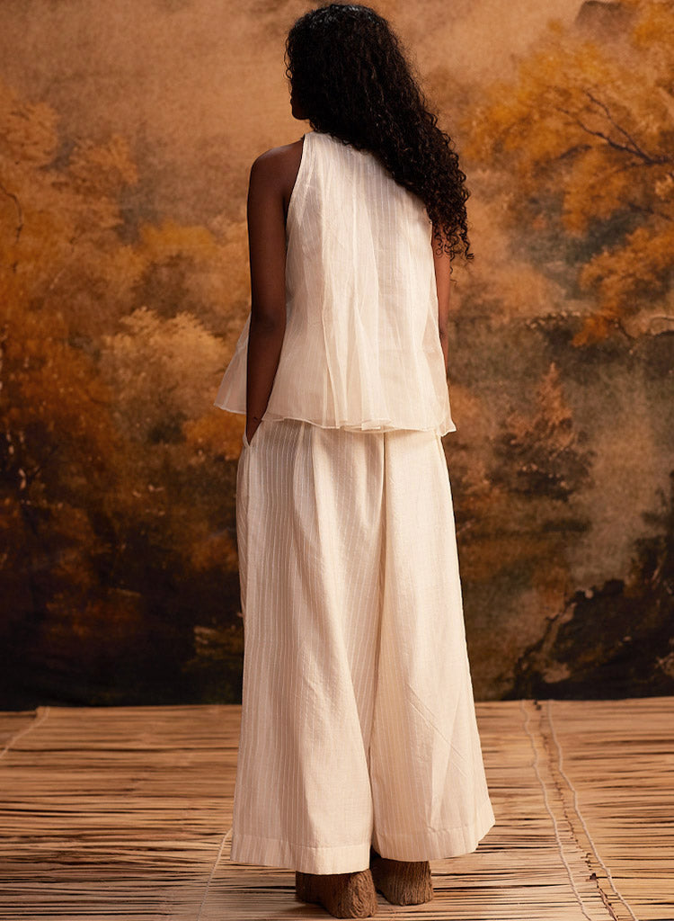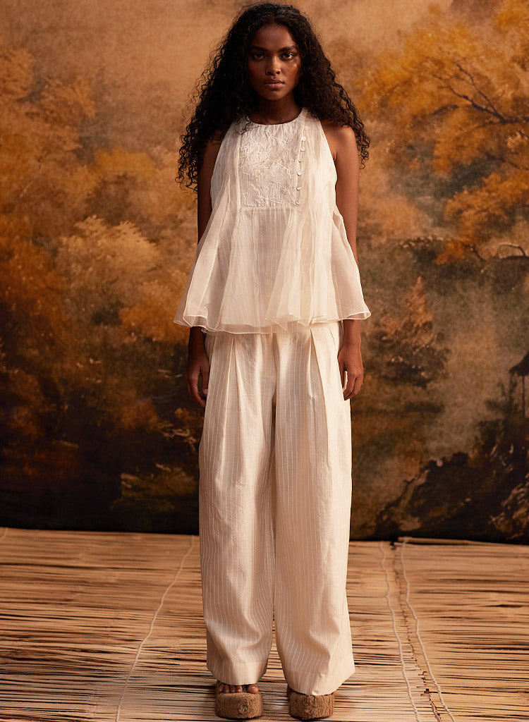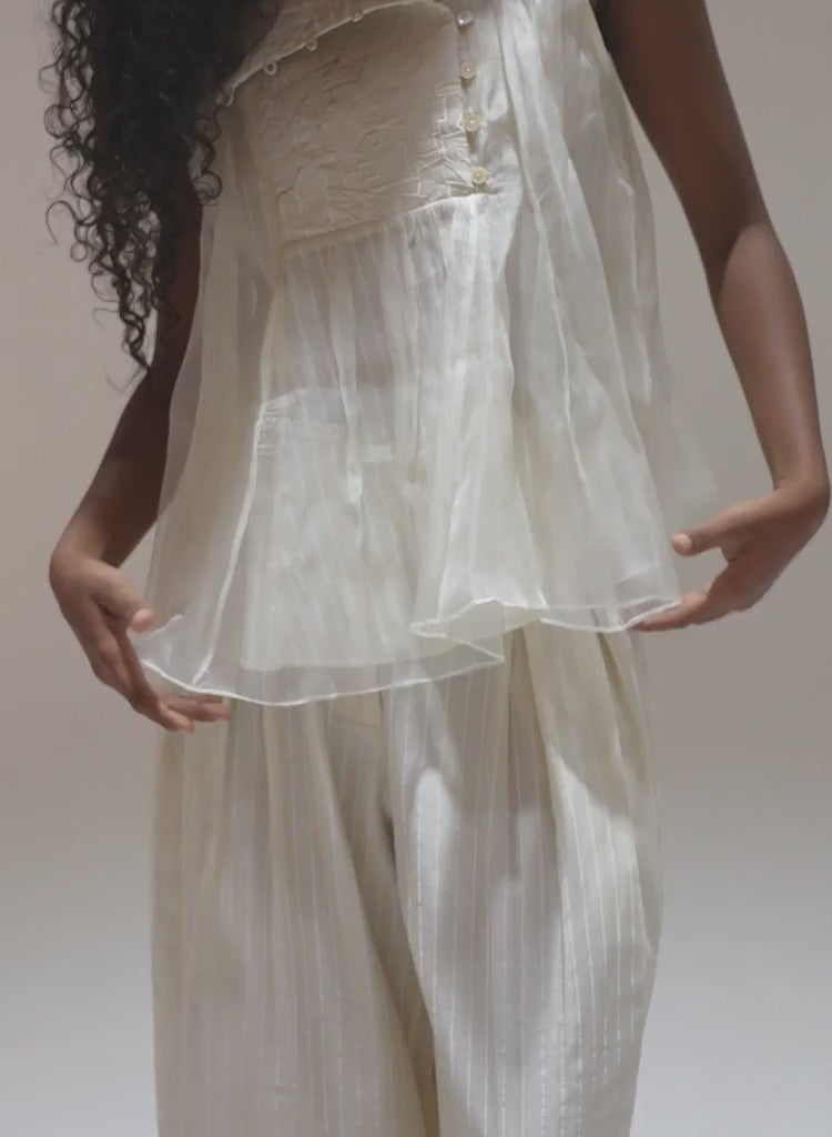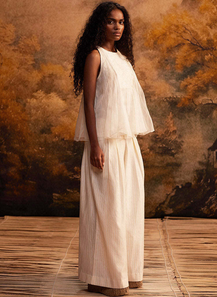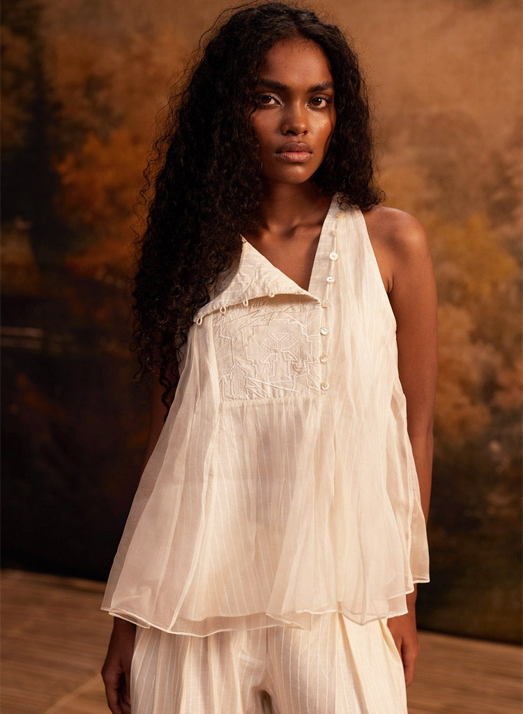 Designed with screen printed cotton panels and a delicately crafted Jaal yoke, this round neck top features dramatic gathers with a side placket. Length 24". The model is 5'8" and is wearing a size M.