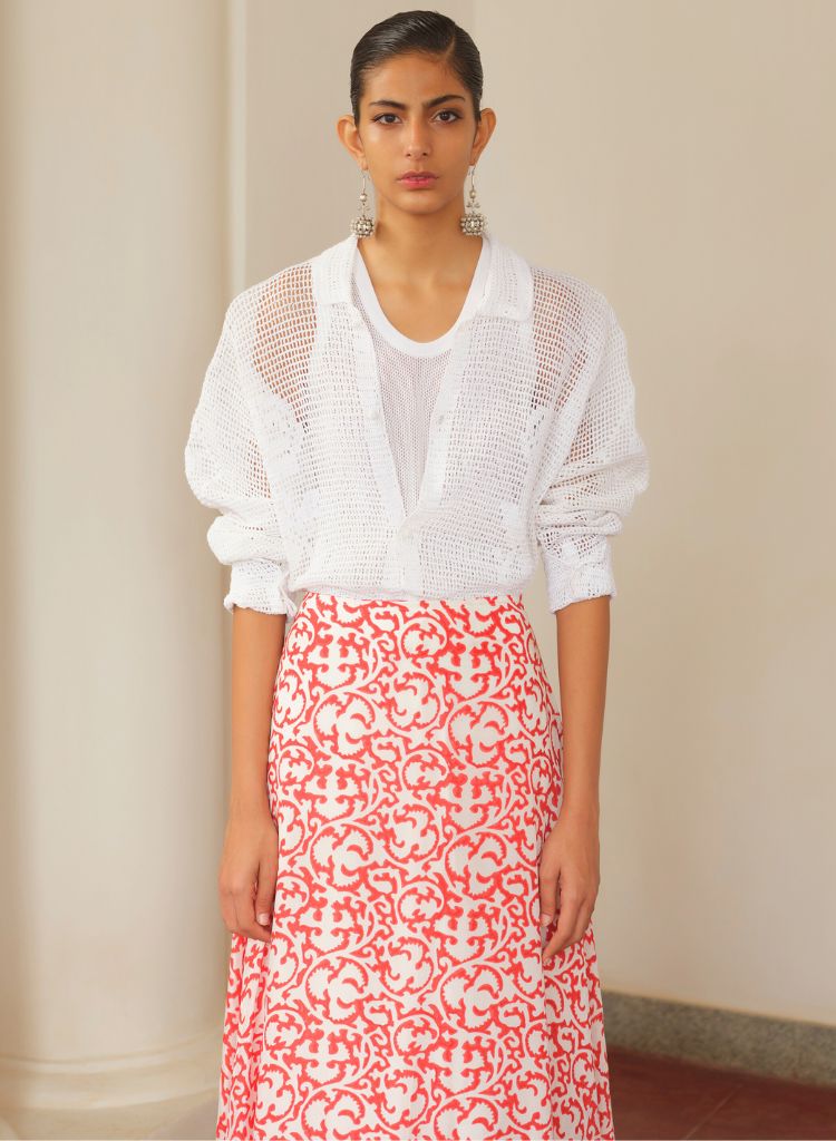 A hand crocheted shirt featuring a loose collar and a front button placket. Length 28". The model is 5'9" and is wearing a size M.