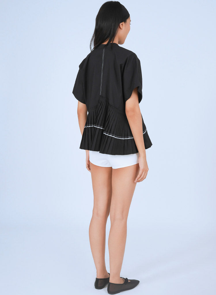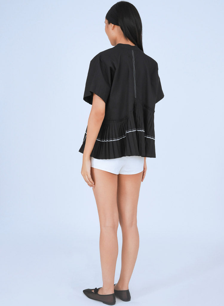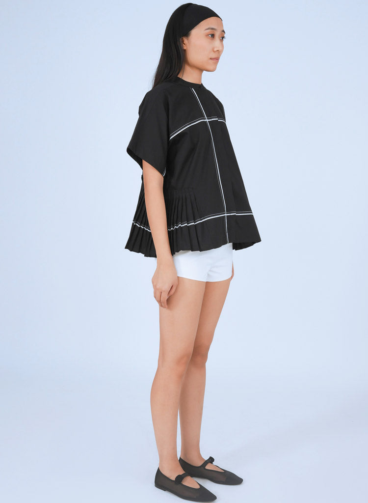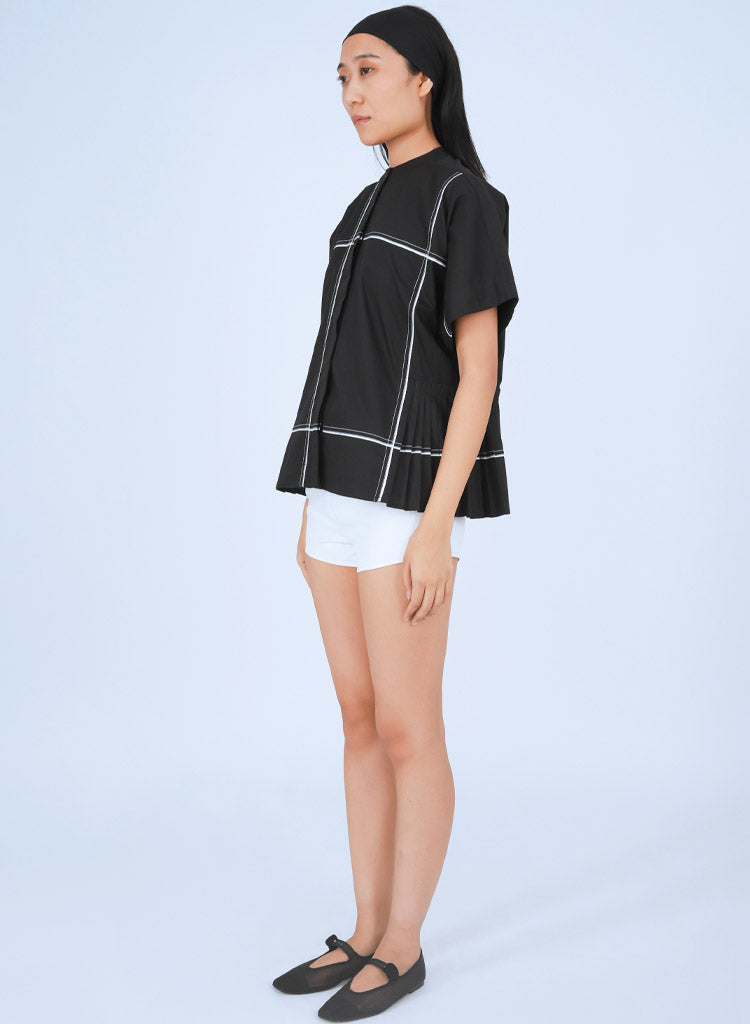 A short sleeve top with contrast piping details and raw edged pleats featuring a band collar and a concealed placket. Length 24". The model is 5'10", and is wearing size M.