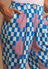 A pair of hand printed and high-waisted pants with front pleat detail and semi-elasticated waist featuring front button-fly closure and side pockets. The model is 5'8" and is wearing size M.