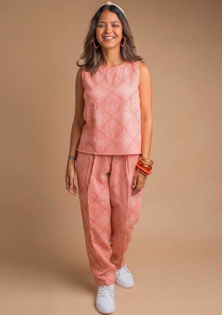 A pair of hand printed and high-waisted pants with front pleat detail and semi-elasticated waist featuring front button-fly closure and side pockets. The model is 5'8" and is wearing size M.