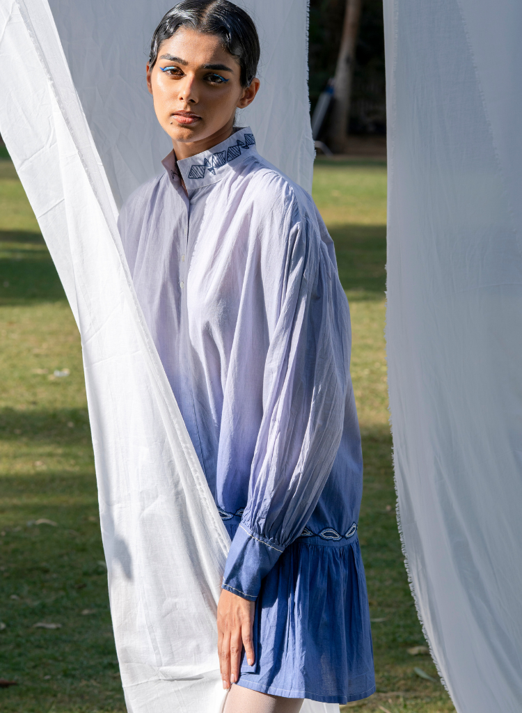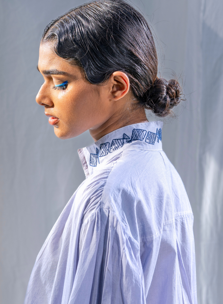 The one-tier gathered shirt dress features a pointed mandarin collar and balloon sleeves, adding volume to the silhouette. The shoulder line is gathered. It has concealed side pockets for everyday ease. A single inverted box pleat at the center back allows for movement and a flattering drape. The dress is embroidered with a wave-like pattern inspired by the rhythm and flow of the ocean. The collar is delicately embroidered with a fish motif. The motifs are achieved using couching and stem stitch. Length 33.5", Bust 60", Hips 58". The model is 5'11" and is wearing a free size.