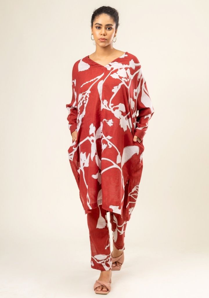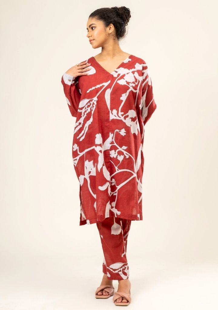 A two-piece set pairing the Helen Kaftan and the Warren Pants. The relaxed-fitting kaftan midi dress with a V-neck and long sleeves features side slits. Length 42". The matching printed pants with an elasticed waist feature side pockets. Length 38". The model is 5'7" and is wearing size S.
