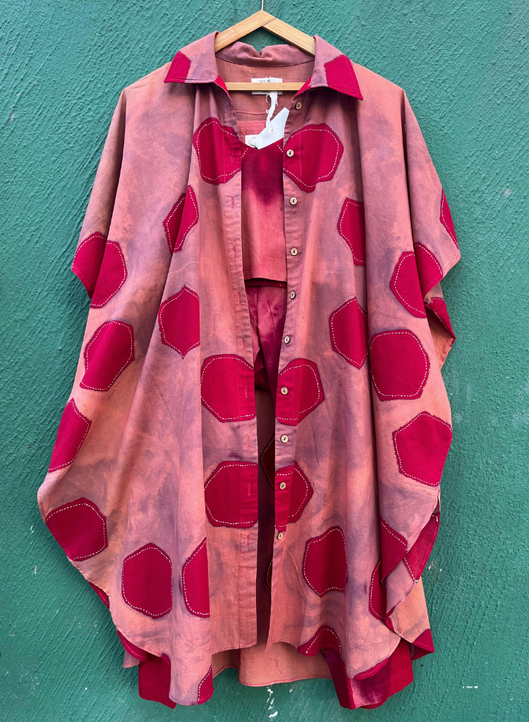 A three-piece set pairing the Hibiscus Hexa Jacket, the Hibiscus Hexa Bralette and Shibori pants. The relaxed-fitting long jacket with hexagon blocks all-over, embellished with Kantha embroidery, a front button-down placket, a curved hem and small side slits features a classic collar and short sleeves. Length 40". The bralette with intricate kantha work detail features a V-neck and spaghetti sleeves. Length 15". The relaxed-fitting Shibori pants feature an elasticated back waist belt. Length 36". The model is 5'4" and is wearing a size M.