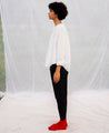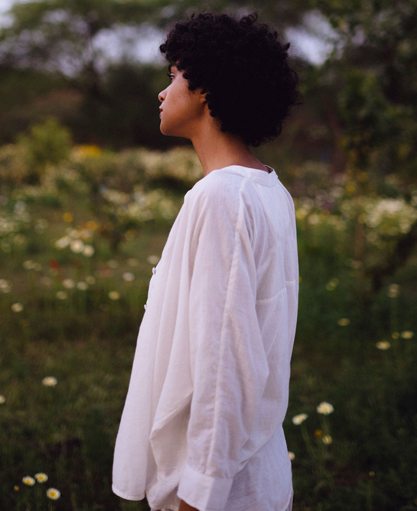 An easy cotton shirt with kimono sleeves and a curved hem. Comes with a striped cotton silk slip. Length 24".