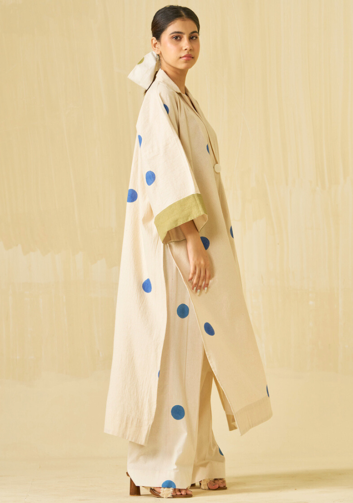 A pair of elongated trousers with hand block printed polka dots. Features an elasticated waistband. Length 40". The model is 5'5" and is wearing size S.