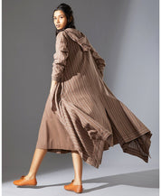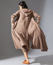 A drapey striped asymmetric jacket with a hood. Features ribbed cuffs, a single front button and inseam pockets. Length 52".