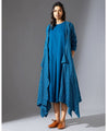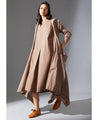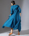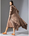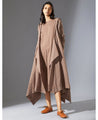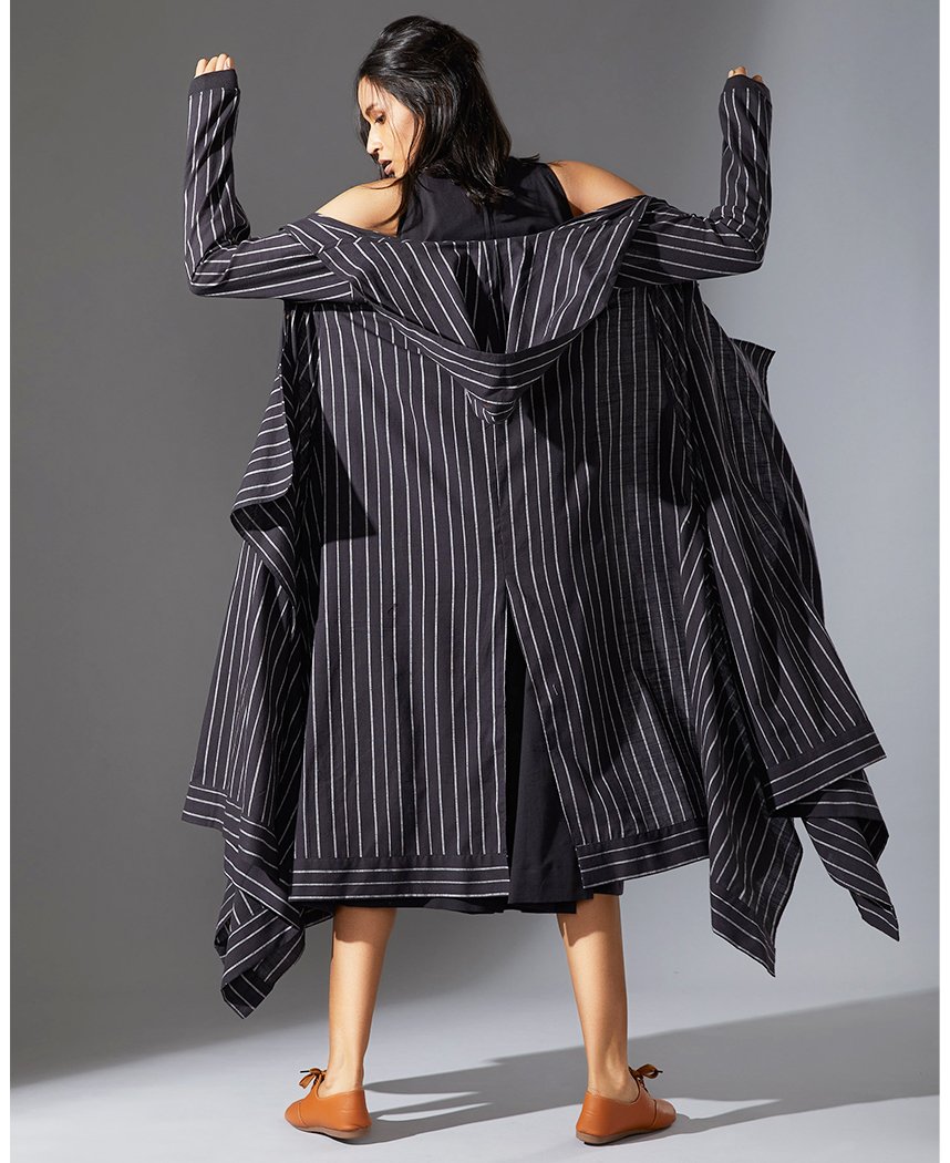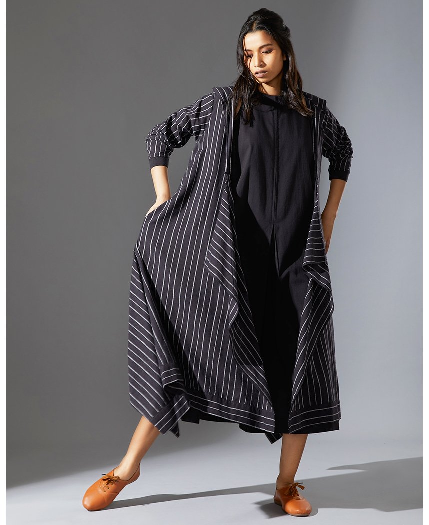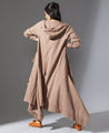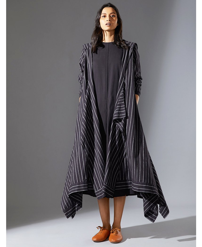 A two-piece set pairing the Hooded Koza Jacket and Vita Aakar Dress. The jacket features a drapey asymmetric hem, a hood, ribbed cuffs, a single front button and inseam pockets. Length 52". The dress features inverted pleats, a closed neck, back button and inseam pockets. Length 45".