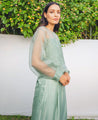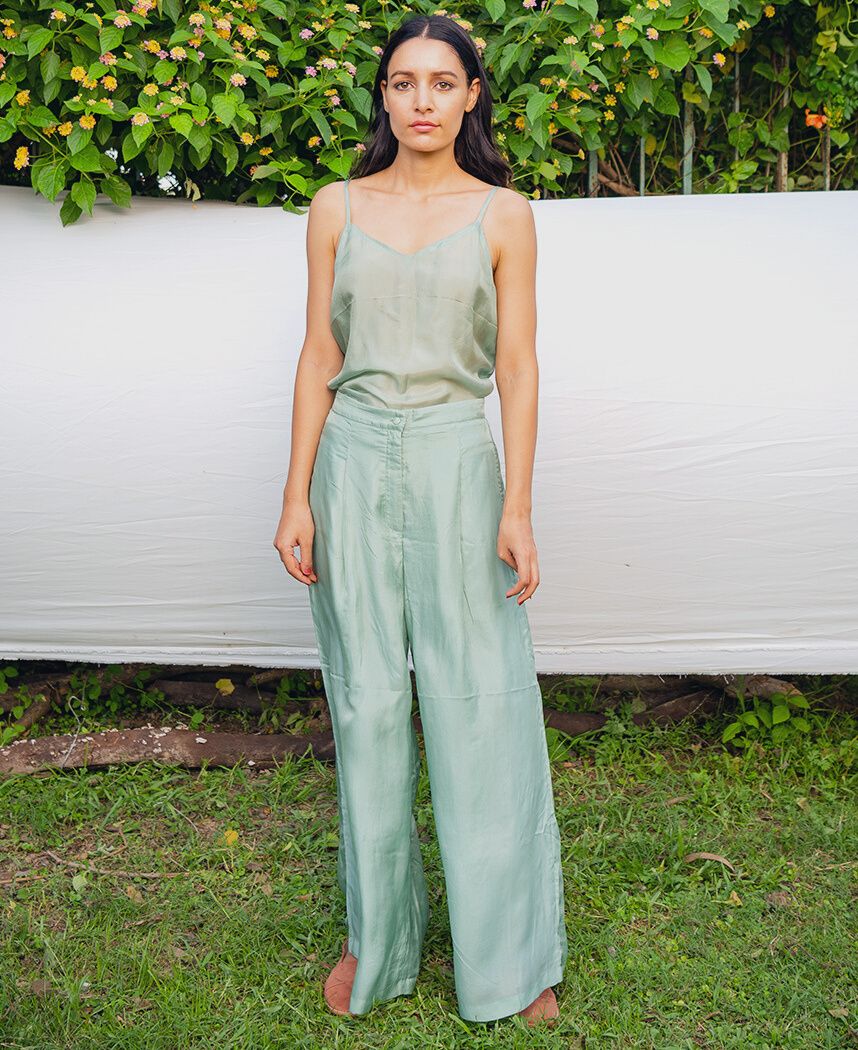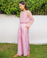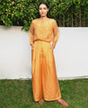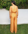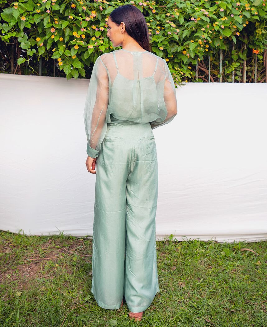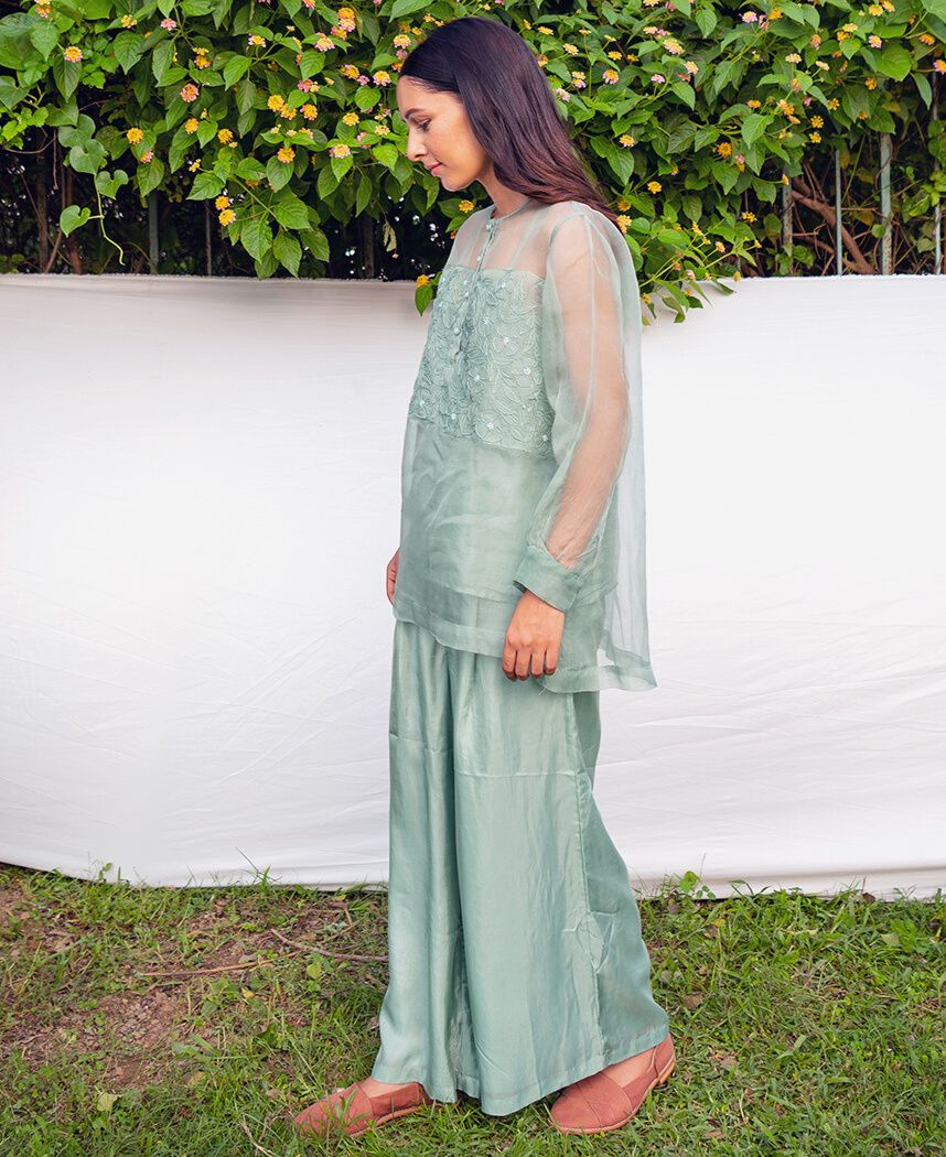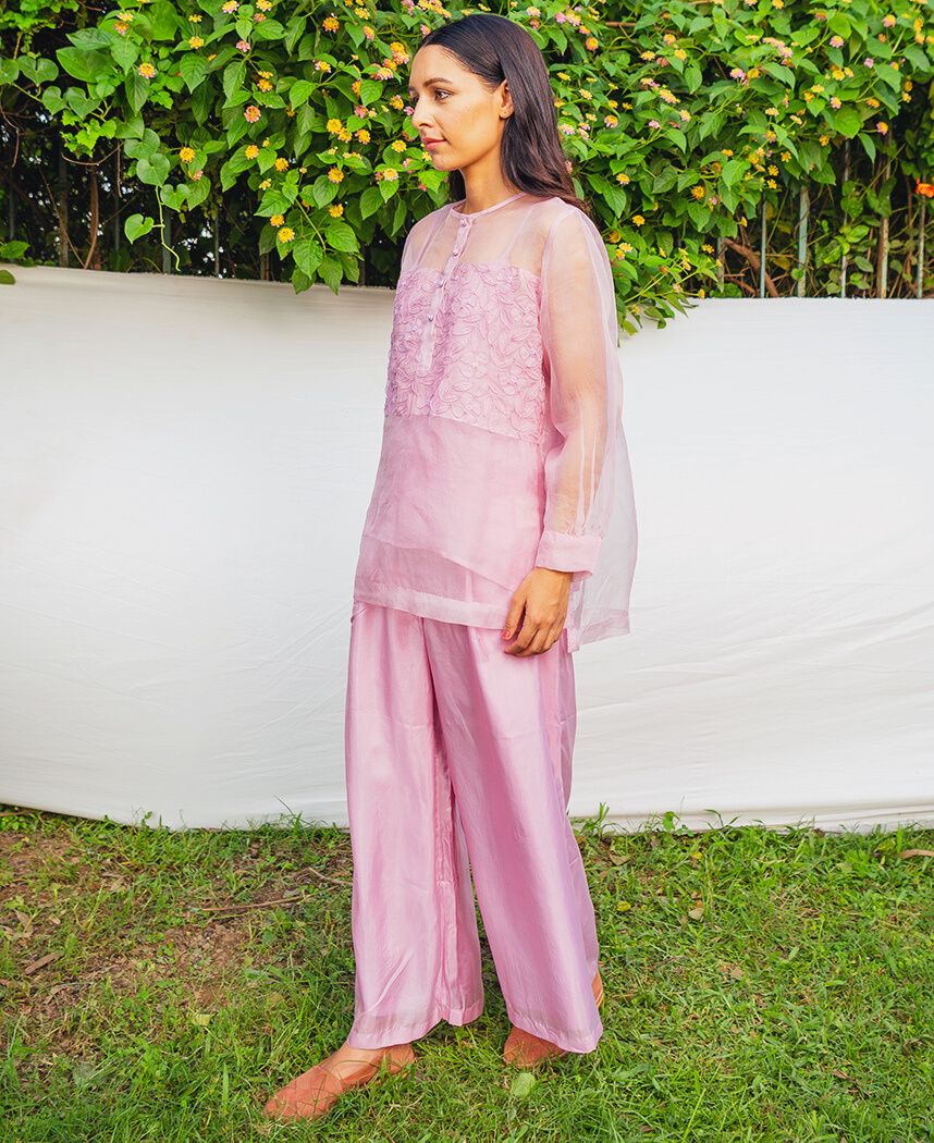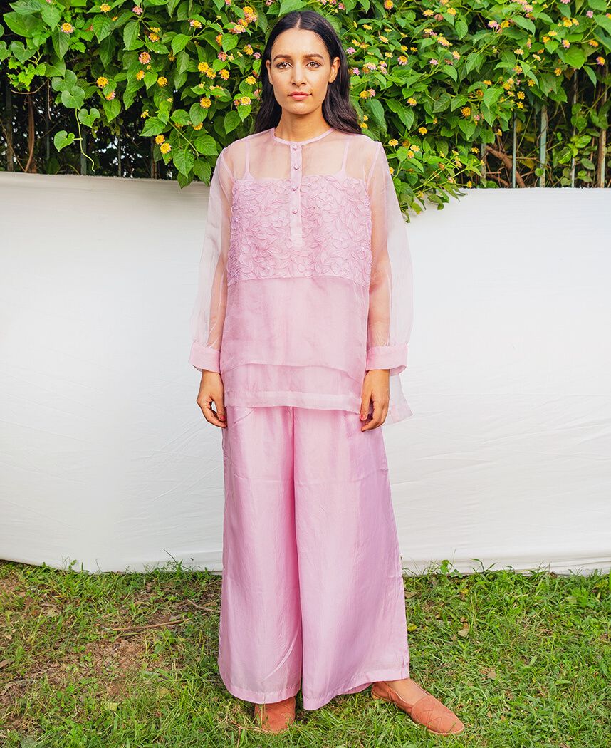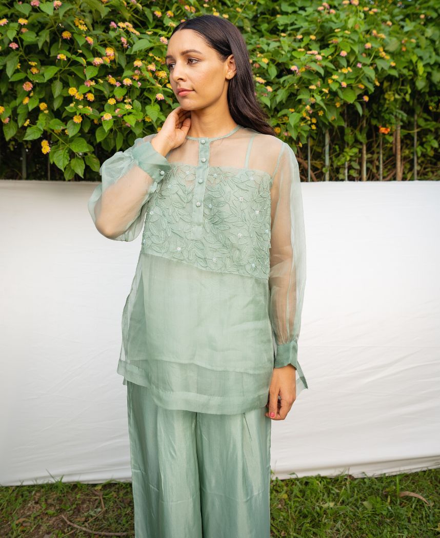 A sheer top with hand embroidered 3D flowers. Features a front button placket and cuffed sleeves. Length 26". Model is wearing a size S. Made in 100% silk organza. Comes with a lining in viscose tabby.