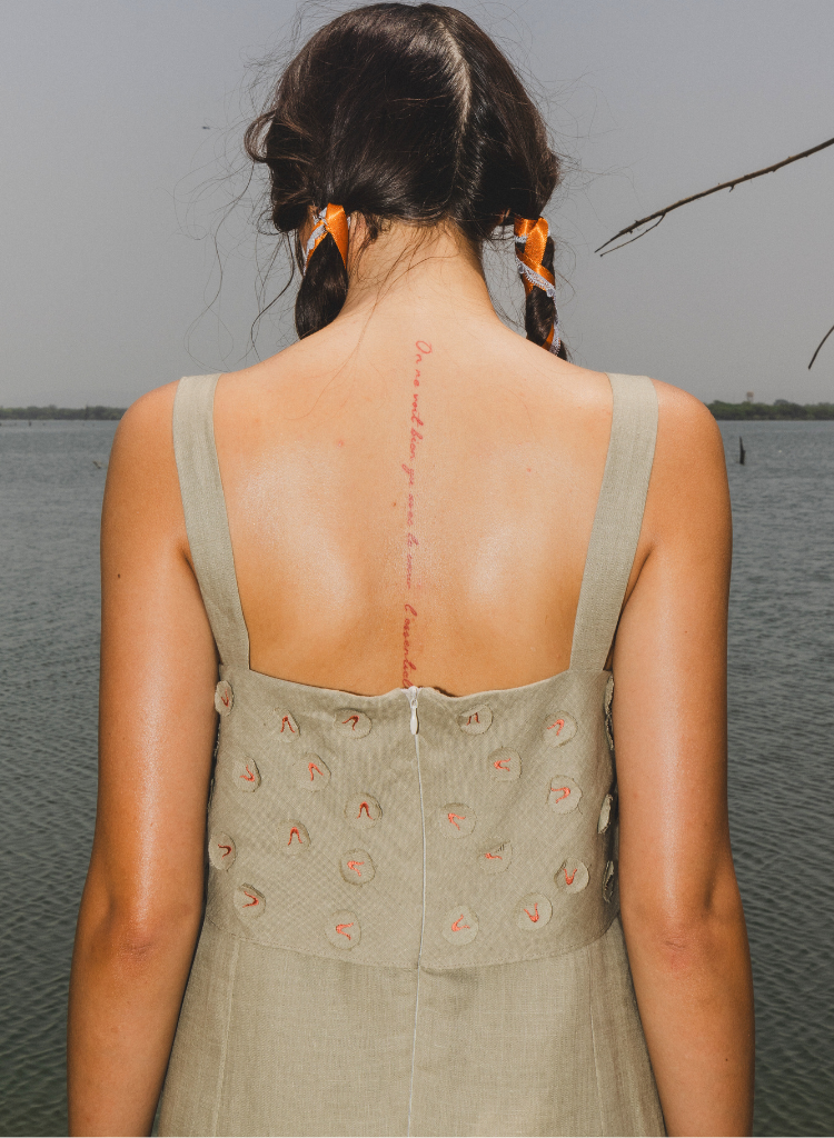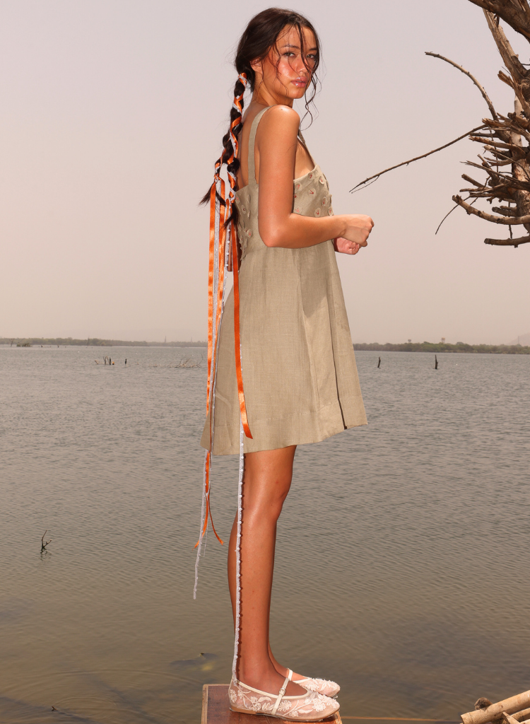 A flared mini dress with circluar applique details on the bust. Features a square neck, wide shoulder straps and a back zipper. Length 32". The model is 5'9” and is wearing size S.
