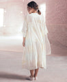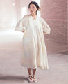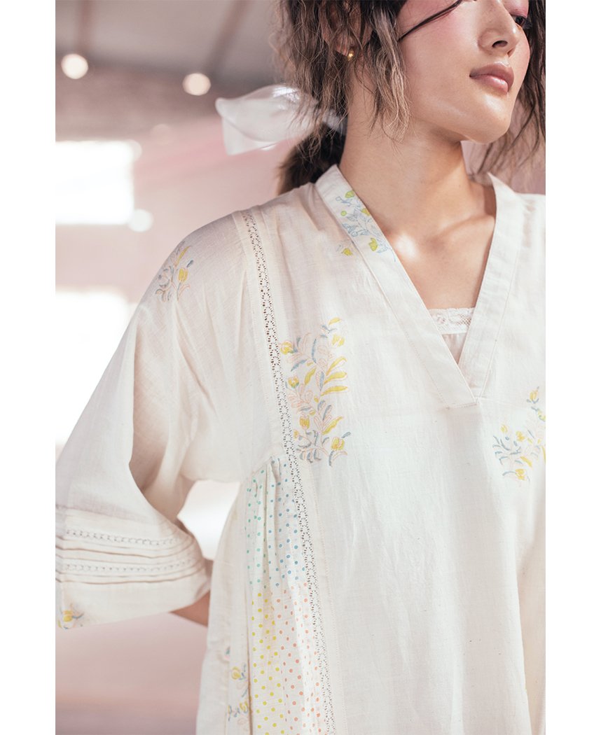 A relaxed side gathered dress with delicate hand block printed polka dots and flowers. Features a V-neck, lace detailing and inseam pockets. Comes with a slip. Length 45". The model is 5'6" and is wearing size S.
