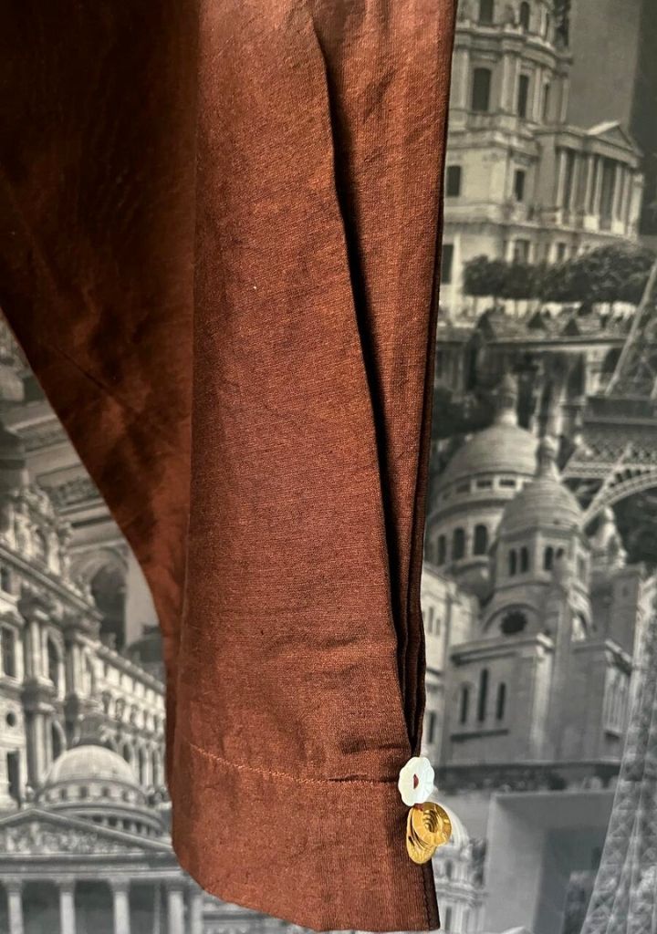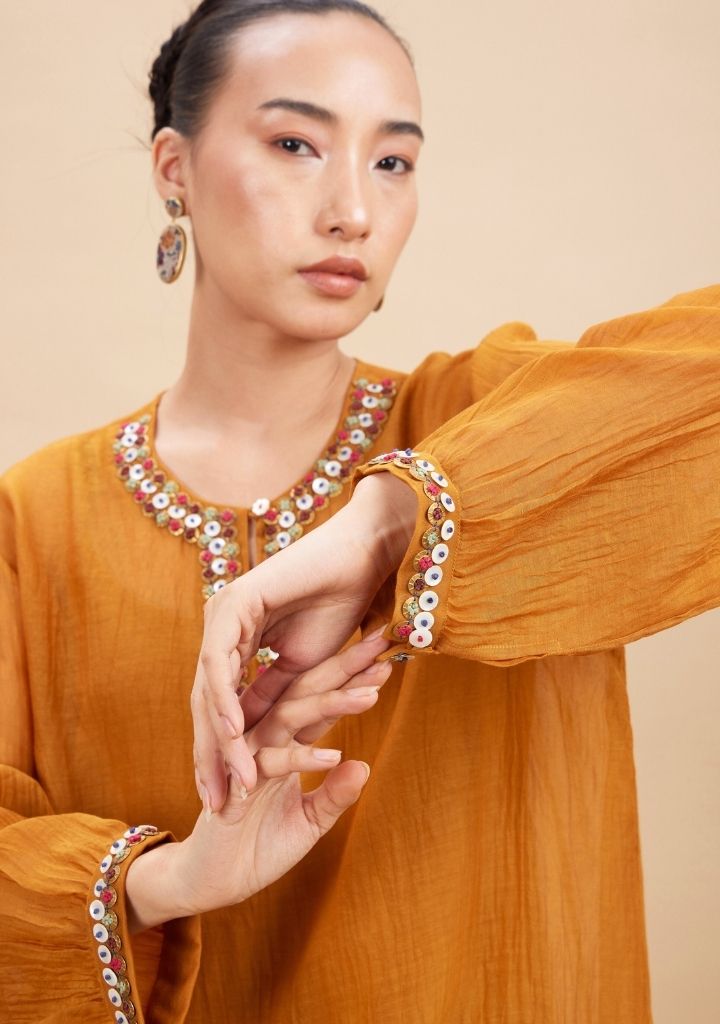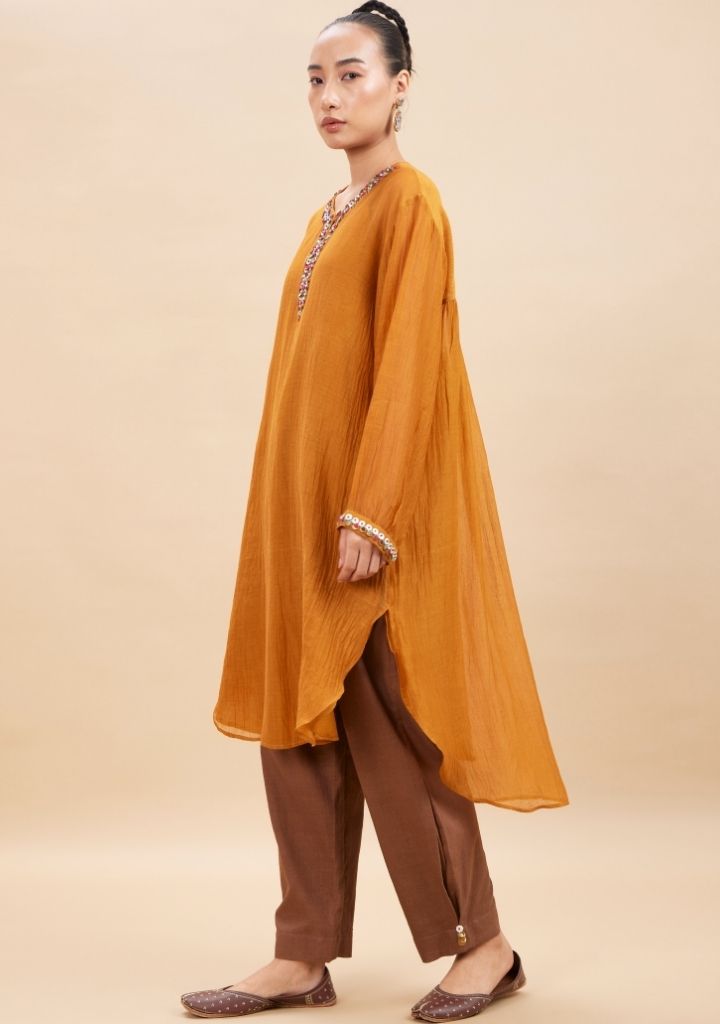 A two piece set pairing a hand-embroidered kurta and matching pants. The hand-embroidered kurta features a round neck and a curved hem. Length 40". Made in cotton Chanderi. The matching pants feature an elasticated waist. Length 37". Made in cotton.
