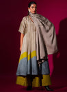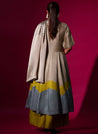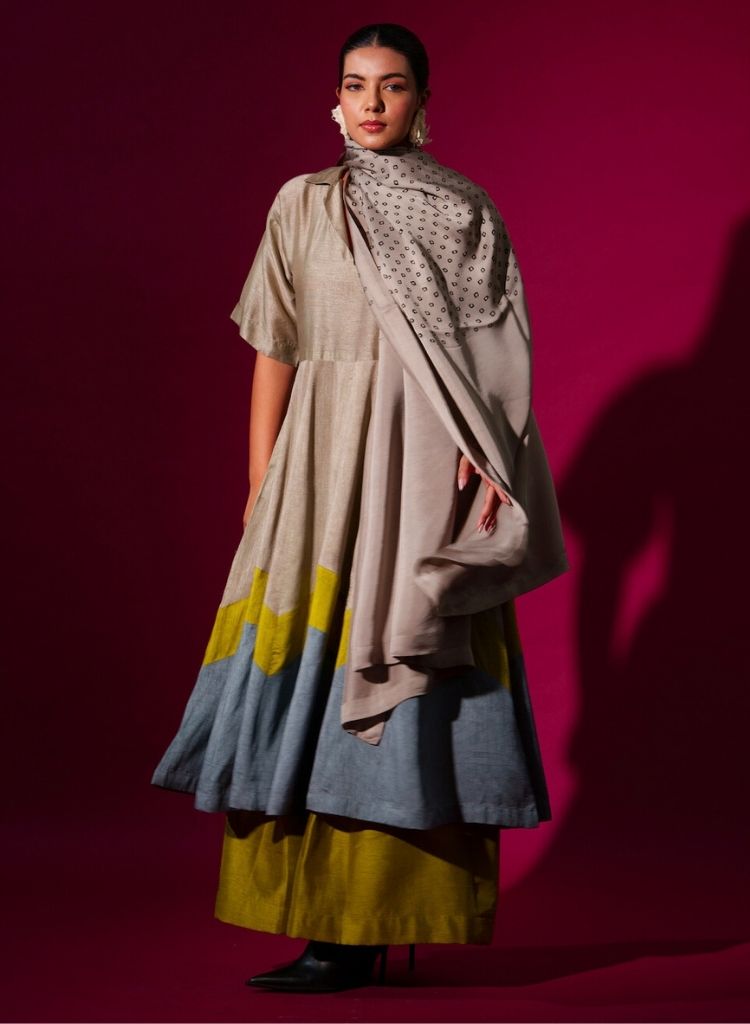 A fit and flared dress with colour blocking details featuring a collared neck and short sleeves. Length 48". The model is 5'8" and is wearing size S.