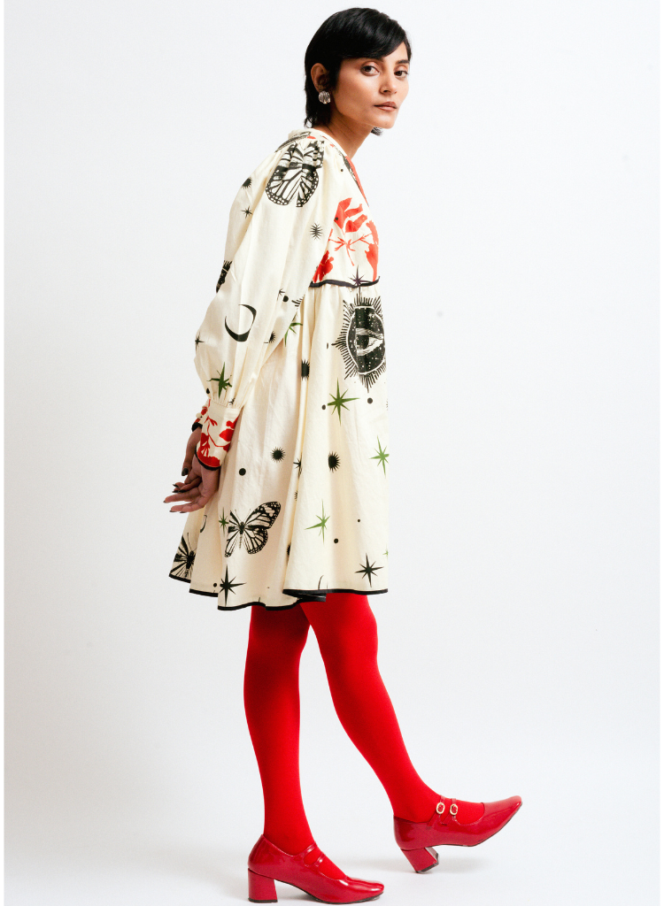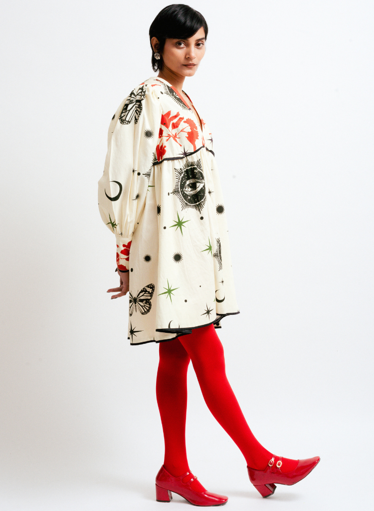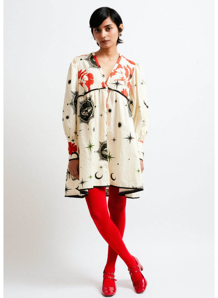 A relaxed fitting midi dress with enchanting motifs of multiple celestial bodies and bursts of vibrant red accents featuring a V-neck, and long sleeves with gathered details and bold cuffs. Length 32". The model is 5'5" and is wearing size S.