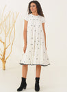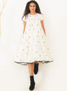 Designed with cap sleeves and a romantic, voluminous silhouette, this dress creates a stunningly fluid movement. The gentle gathers add a touch of sophistication, while the keyhole opening at the back introduces a subtle yet captivating detail. Length 42". The model is 5'8" and is wearing size S.