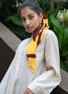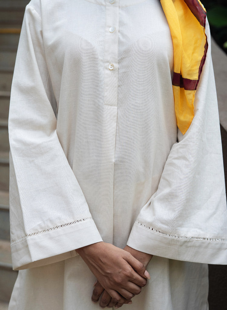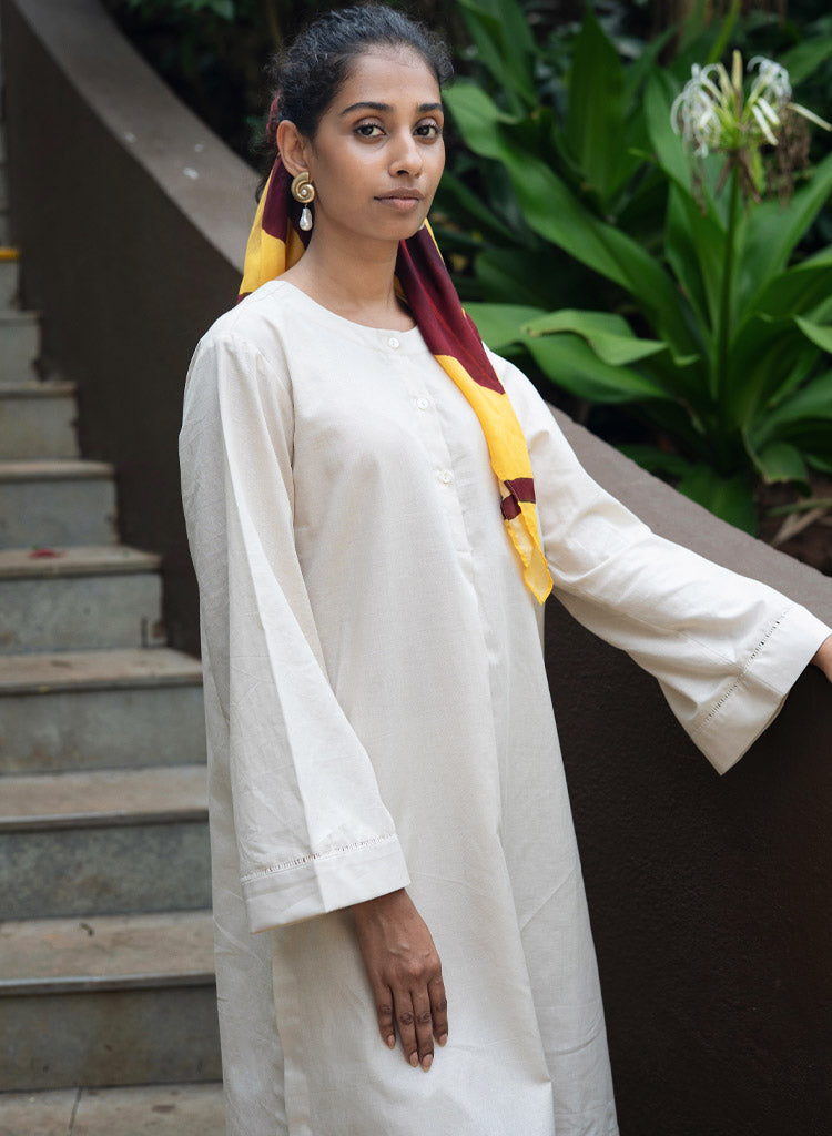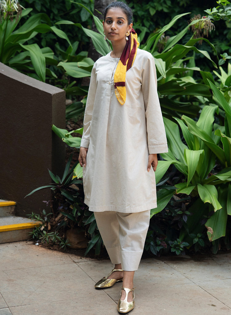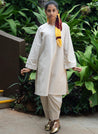 A two-piece set pairing a Pheran style kurta and matching pants. The Pheran style kurta with fagoting details feature a round neck with a half placket and loose sleeves. Length 38". The matching Pakiza inspired pants feature an elasticated waist. Length 36". The model is 5'11" and is wearing a size M.