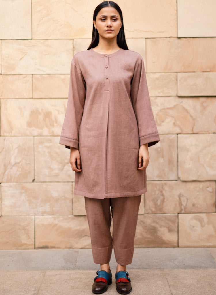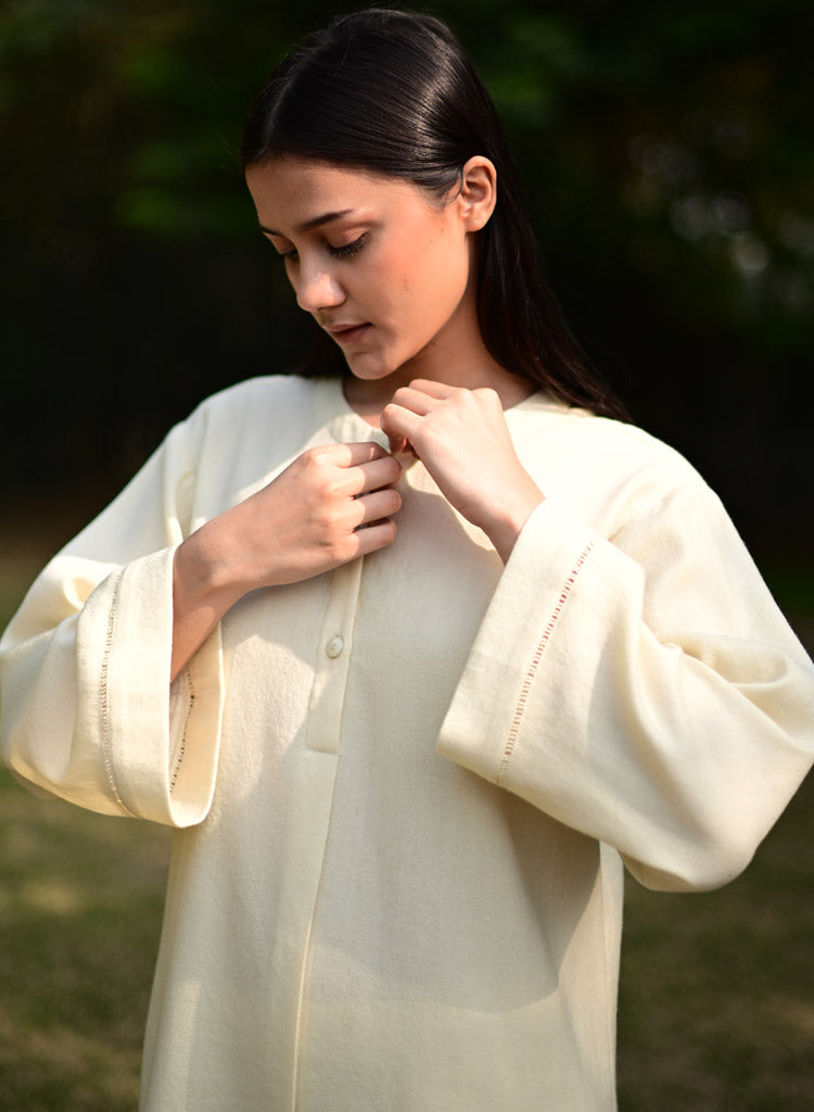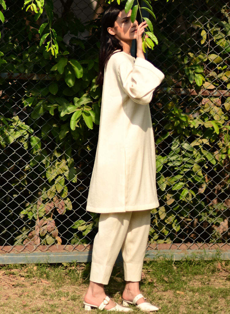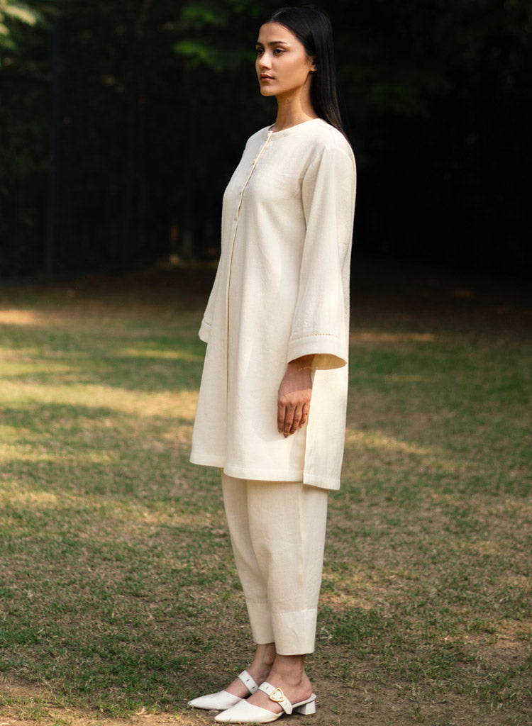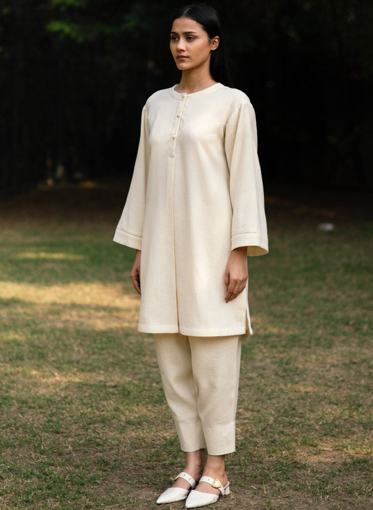 A two-piece set pairing a pheran style kurta and matching pants. The pheran style kurta with faggoting details feature a round neck with a half placket and loose sleeves. Length 38". The matching Pakiza inspired pants feature an elasticated waist. Length 36". The model is 5'10" and is wearing a size M.