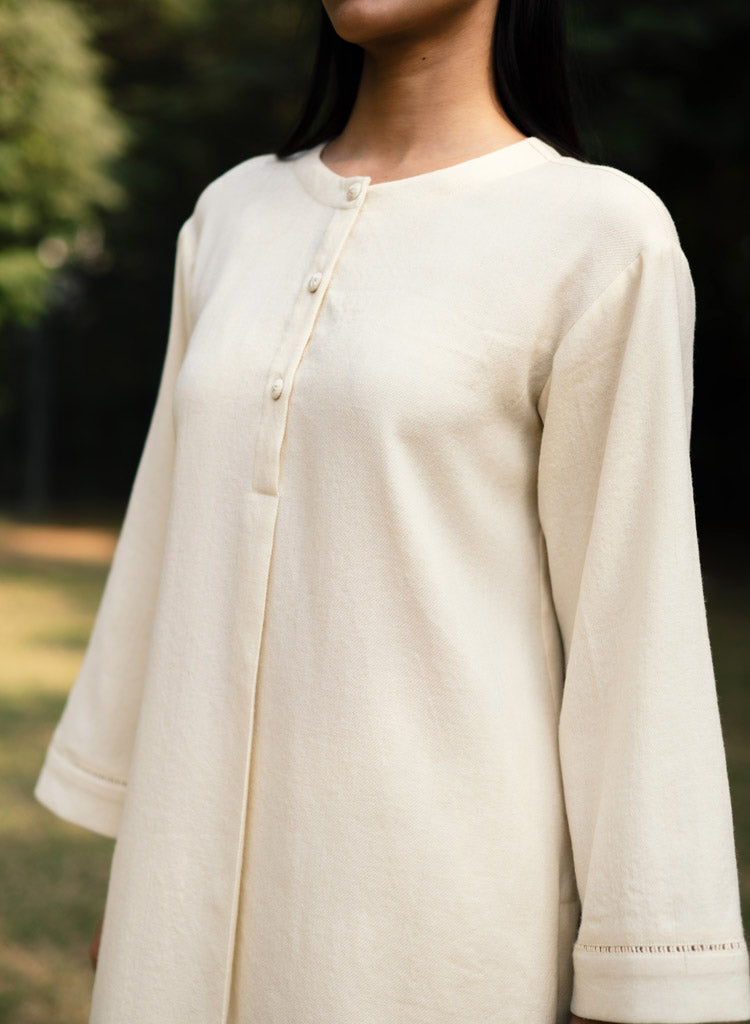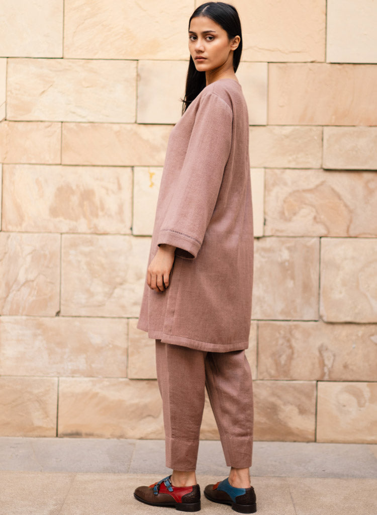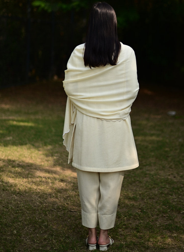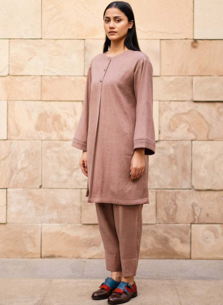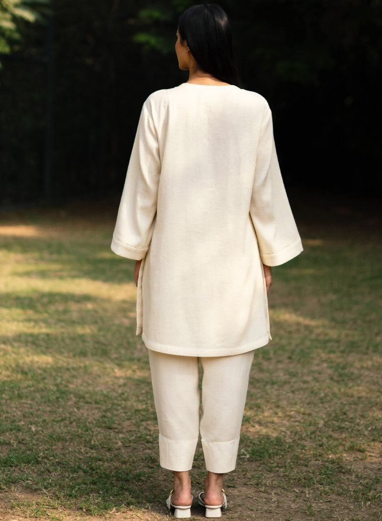 A two-piece set pairing a pheran style kurta and matching pants. The pheran style kurta with faggoting details feature a round neck with a half placket and loose sleeves. Length 38". The matching Pakiza inspired pants feature an elasticated waist. Length 36". The model is 5'10" and is wearing a size M.