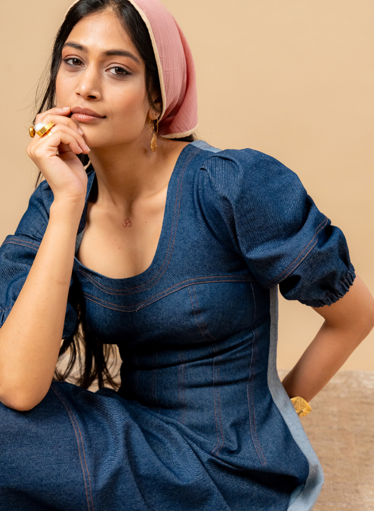 A fitted bustier dress with elasticated sleeves featuring a round neck and inseam pockets. Length 45". The model is 5'8" and is wearing size M.