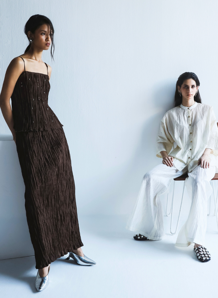 A two-piece set pairing the Ito Silk Top and the Ito Silk Skirts. The fluid flared top hand-embellished with sequins and beads features a square neck, adjustable straps and small side slits. Length 23". The matching straight fit maxi skirt features a fitted waist. Length 36". The model is 5'8", and is wearing size S.