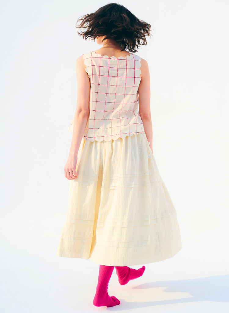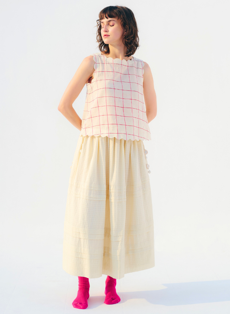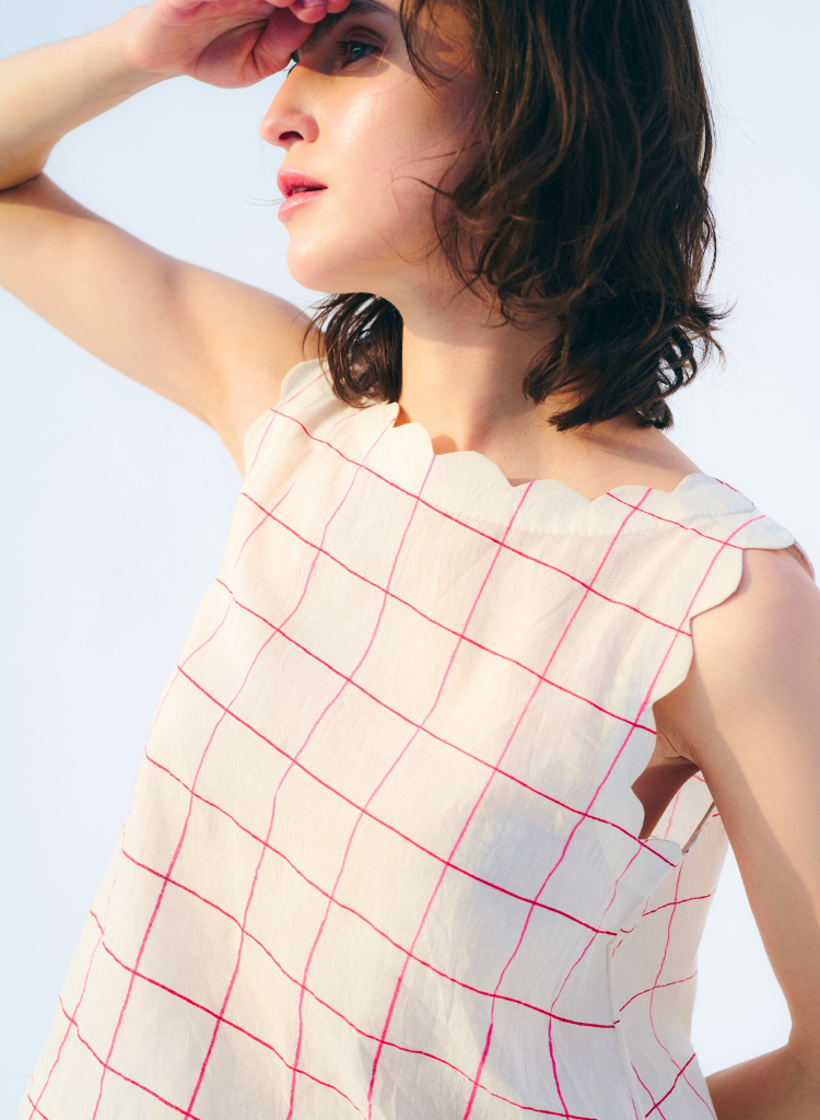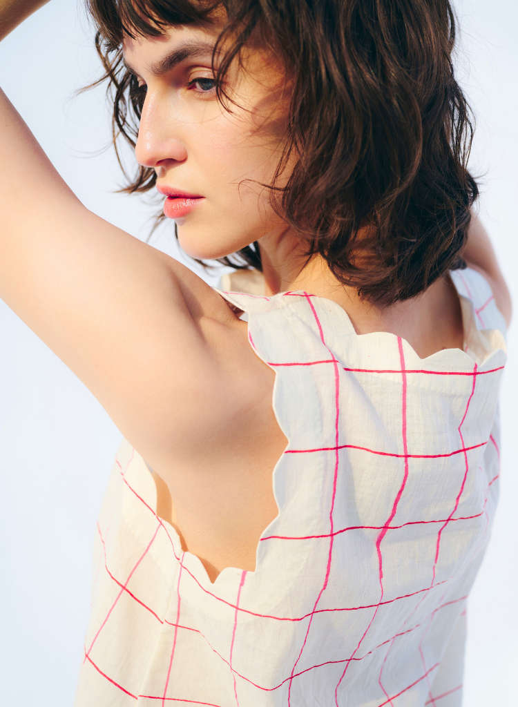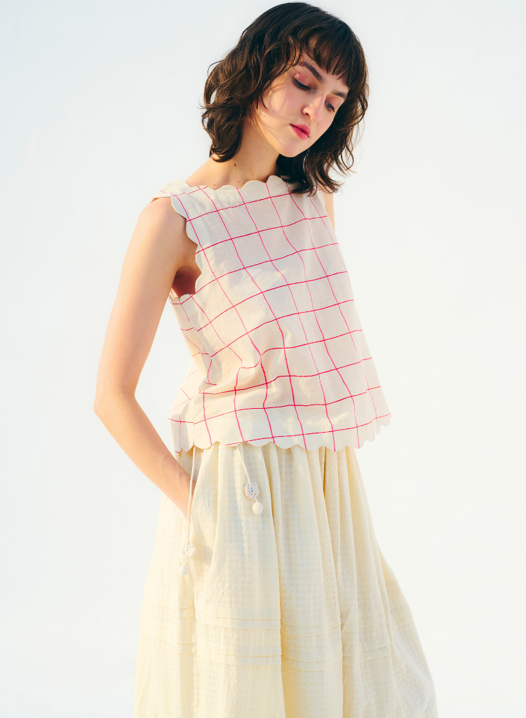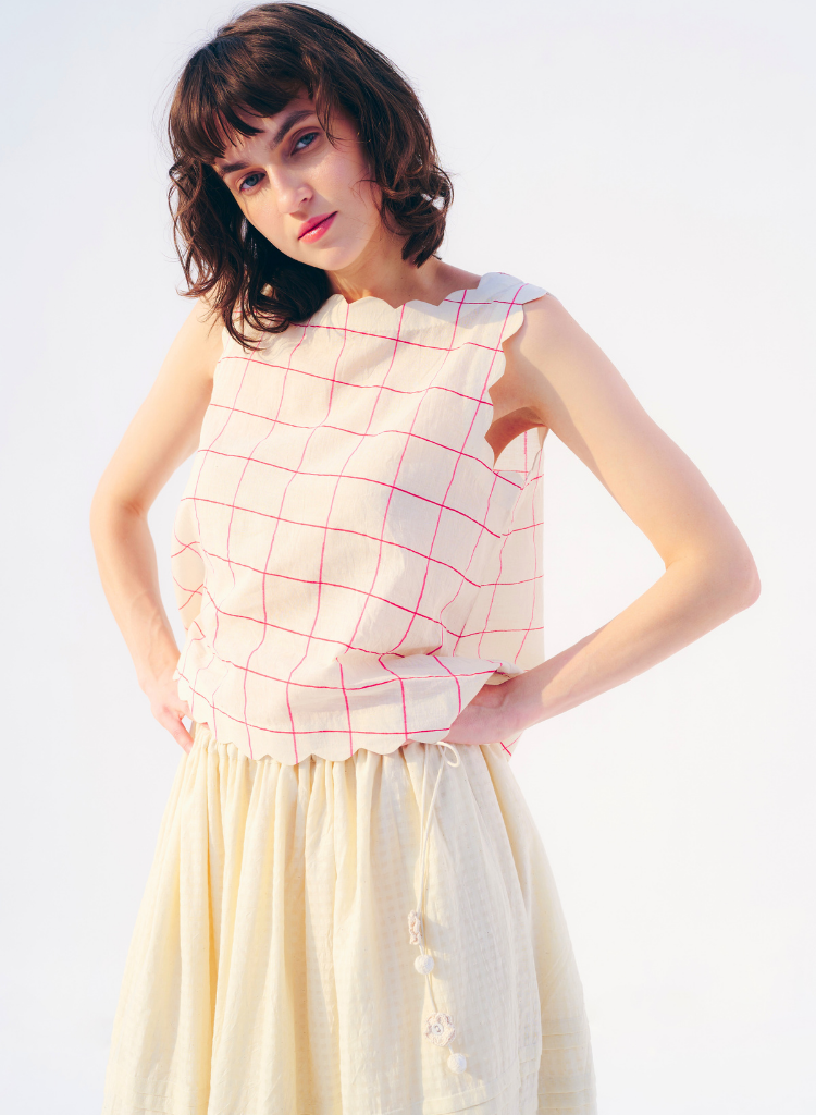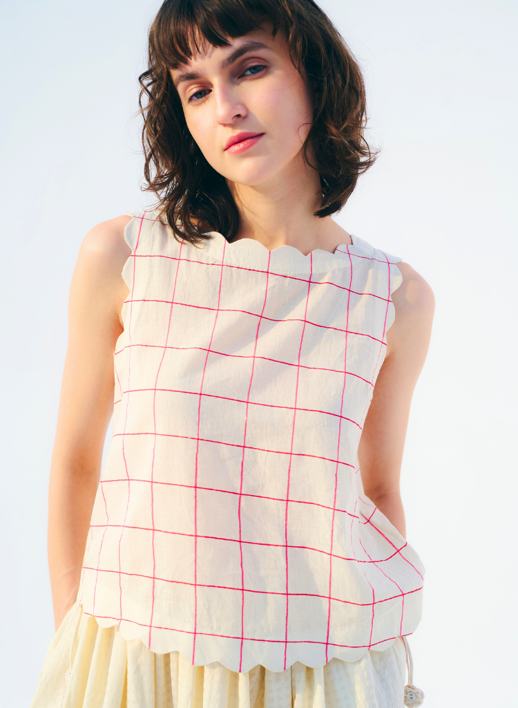 A box cut top with scallop detail featuring a boat neck. Length 20". The model is 5'9" and is wearing a size S.