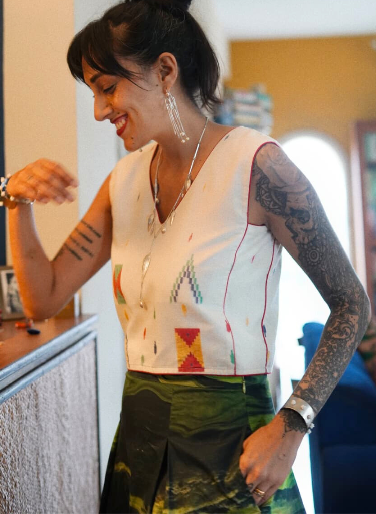 A beautiful Jamdani top, designed to make a statement with its elegant V-neck and striking contrast piping detailing. The back features a sleek jacket zipper fastening, combining functionality with contemporary style. Length 17". The model is 5'8" and is wearing size S.