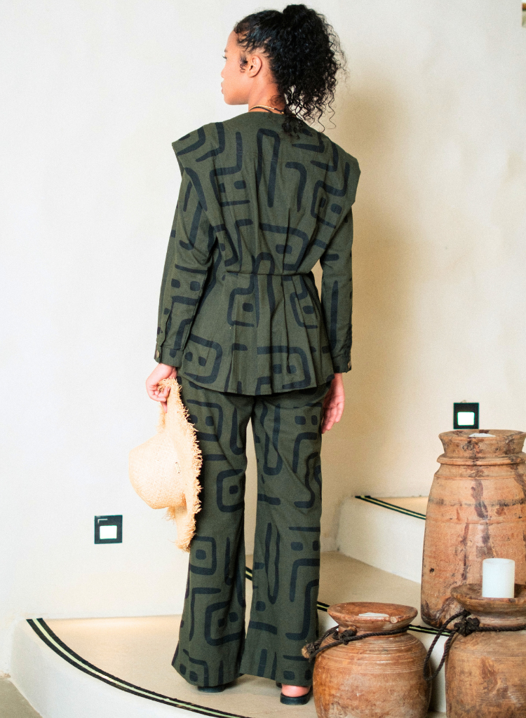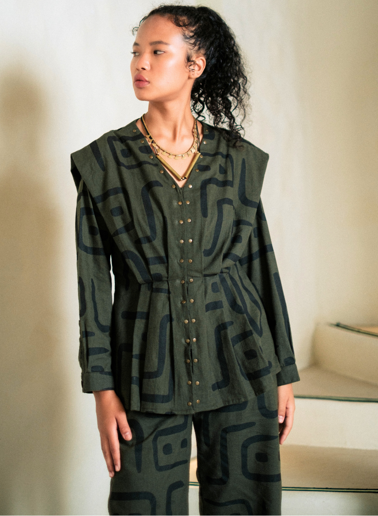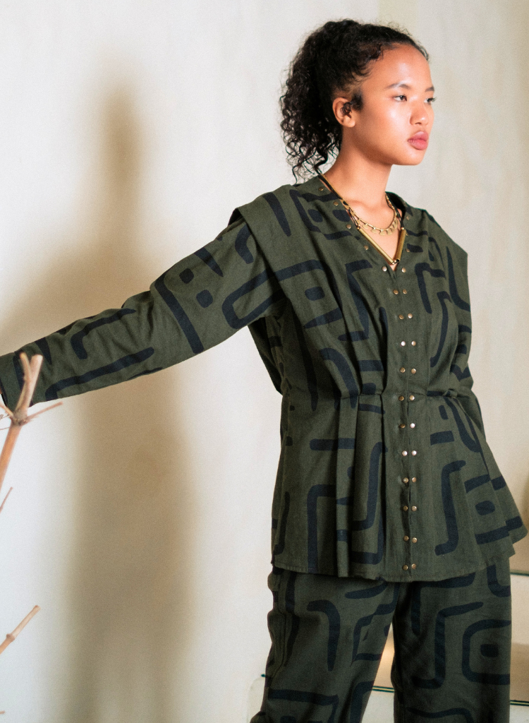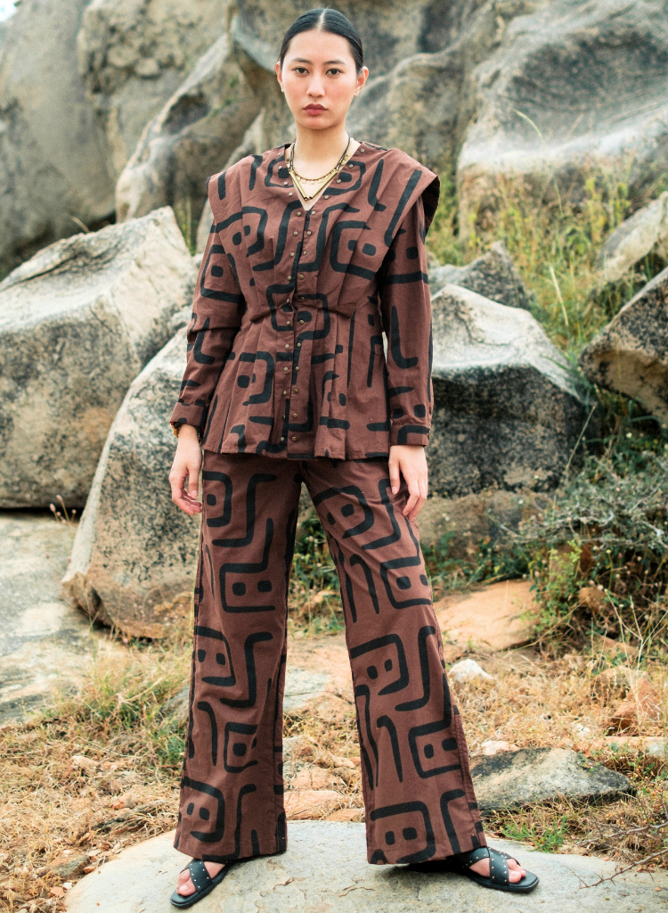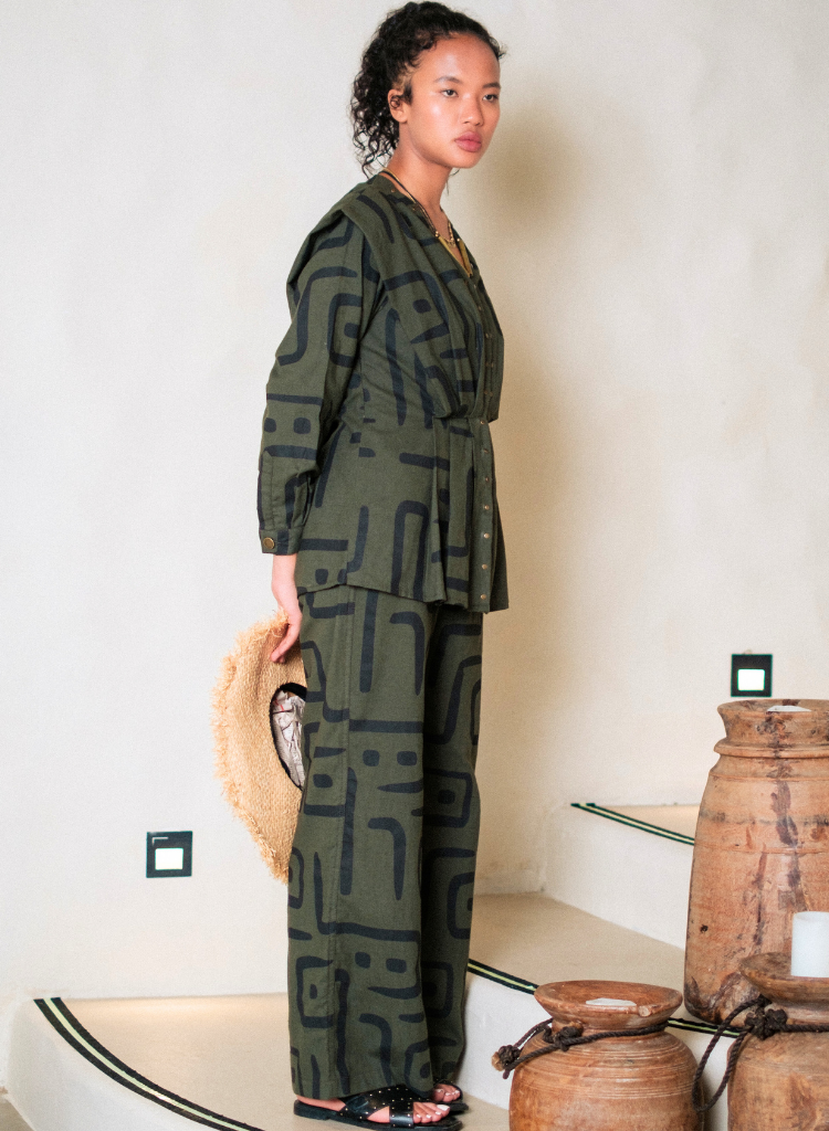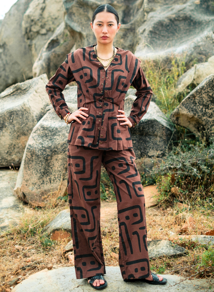 A two-piece set pairing the Izu Peplum Top and the Handwoven Sailor Pants. The top features pleats and metallic rivet detailing. The matching flared pants feature front pockets and an elasticated back. The model is 5'7" and is wearing size S.