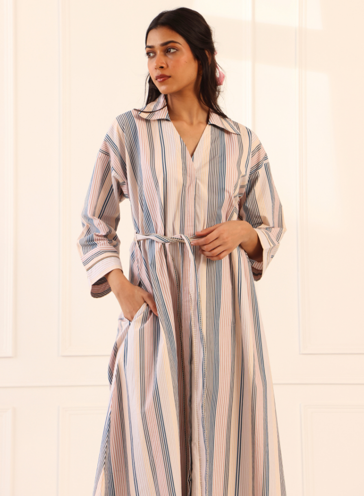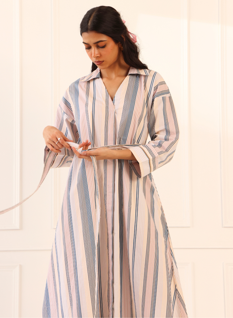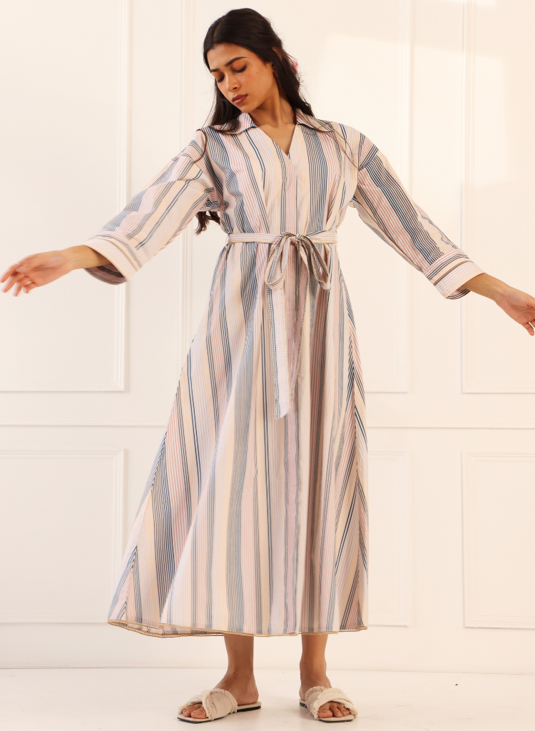 A flared midi dress in a tonal stripe print with delicate lace accents featuring a collared V-neck and inseam pockets. Comes with an hand-embroidered belt. Length 48". The model is 5'5" and is wearing a size S.