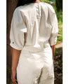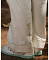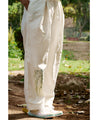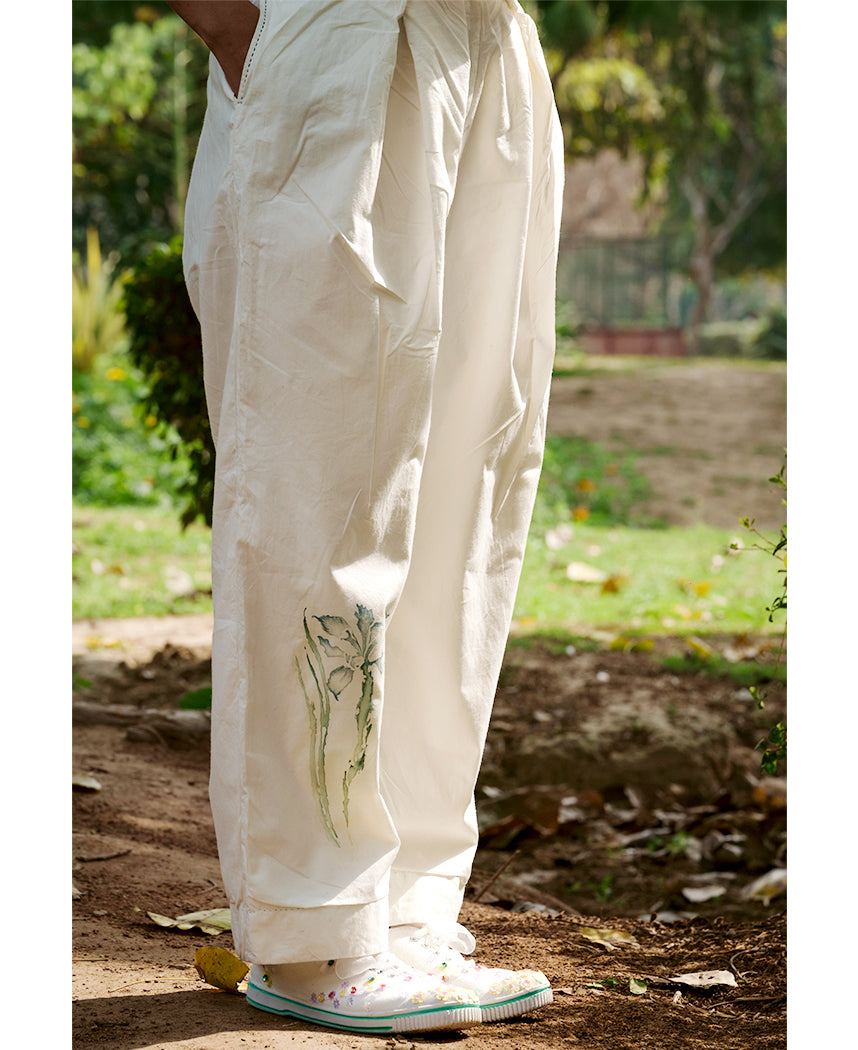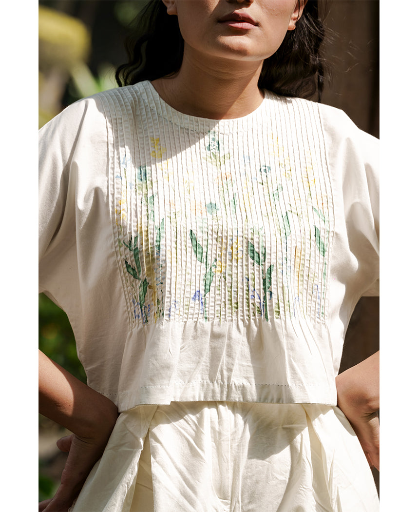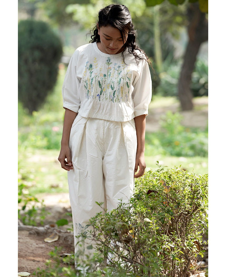 A two-piece set pairing the Jane Pintuck Top and Maria Overlap Pants. The boxy crop top features hand painted flowers on a pin-tucked yoke, embroidered details on the cuffs, a closed neck and a keyhole button at the back. Length 18". The relaxed pants feature an overlap pleat detail, hand painted flowers on the legs, contrast stitches, inseam pockets and a front zip closure. Length 39". The model is wearing a size M.