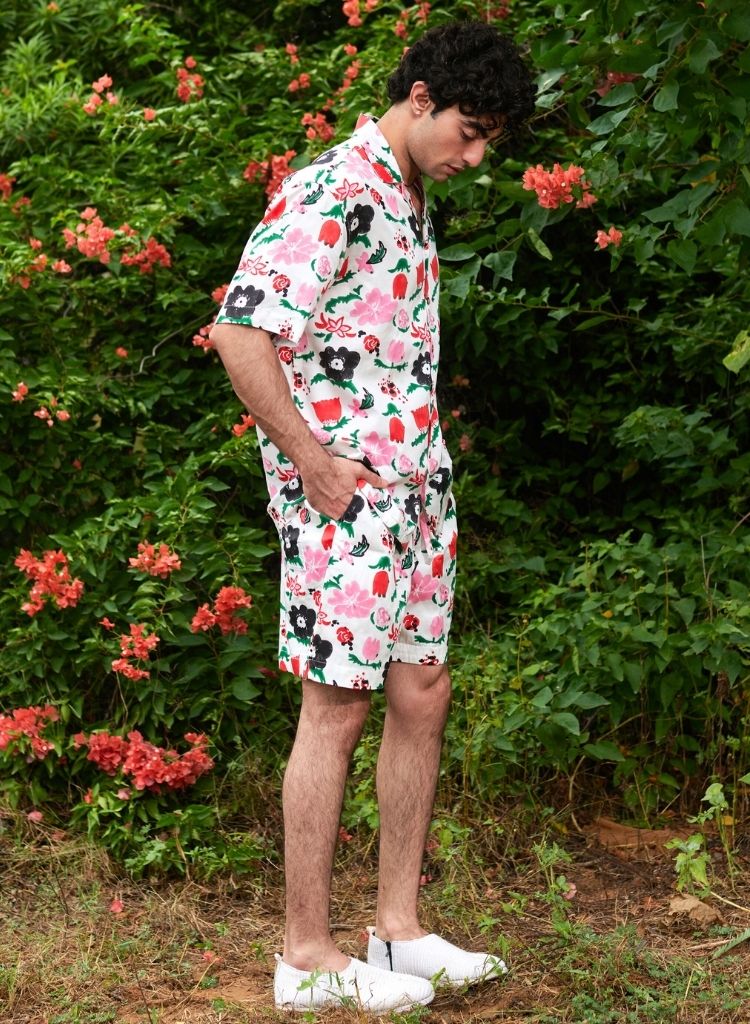 A hand block printed floral shirt featuring a clamp collar and a front button placket with wooden buttons. Length 28.5”. The model is 6ft and is wearing a size S. Made in Modal satin, dyed using chemical free dyes. This piece is hand block printed and handcrafted in small batches. Variations in colour, texture, print and finish are inherent to the process, making each piece unique.