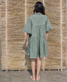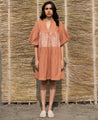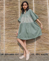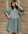 A short tiered dress with hand-embroidered flowers. Features a collared V-neck and elasticated balloon sleeves. Length 36". The model is 5'7" and is wearing a size S.
