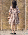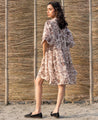 A short-tiered dress with a floral hand-block print. Features a collared V-neck and elasticated balloon sleeves. Length 36". The model is 5'7" and is wearing a size S.