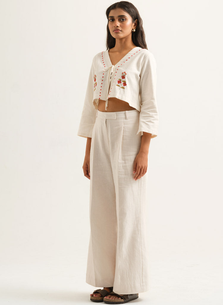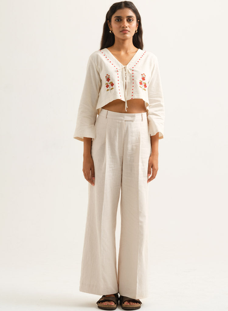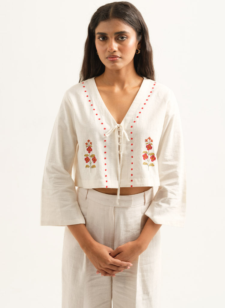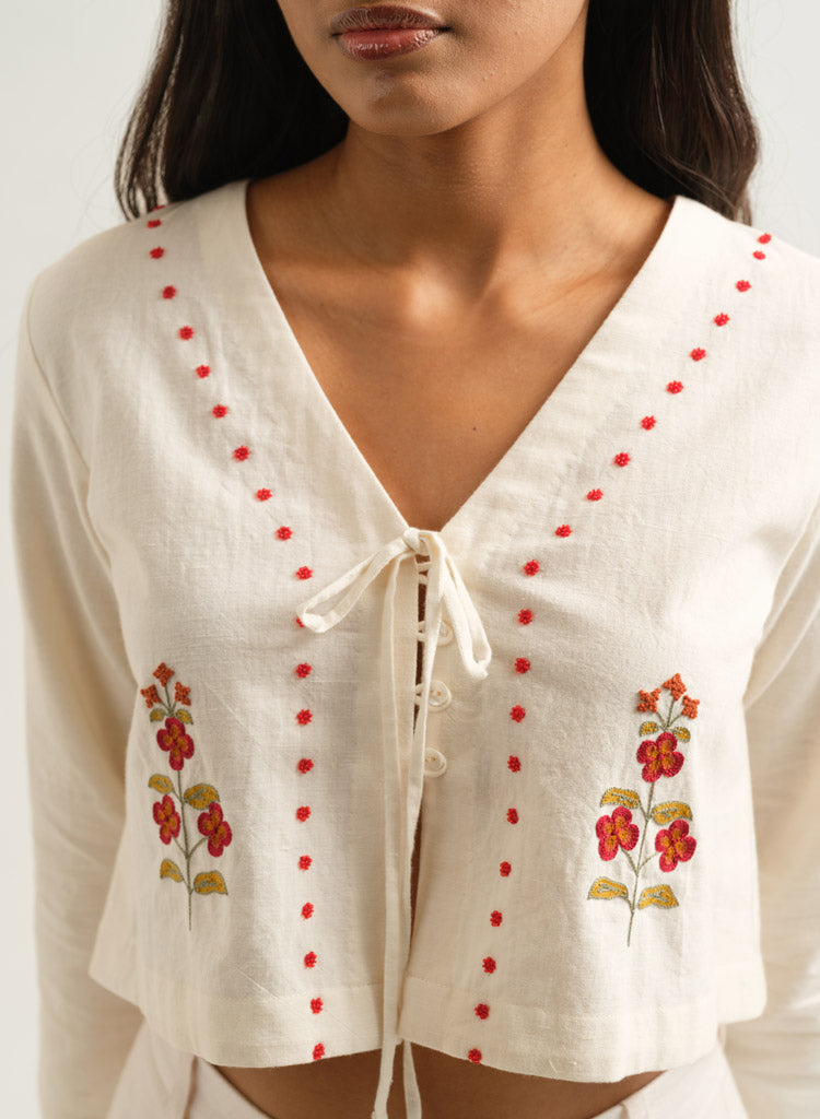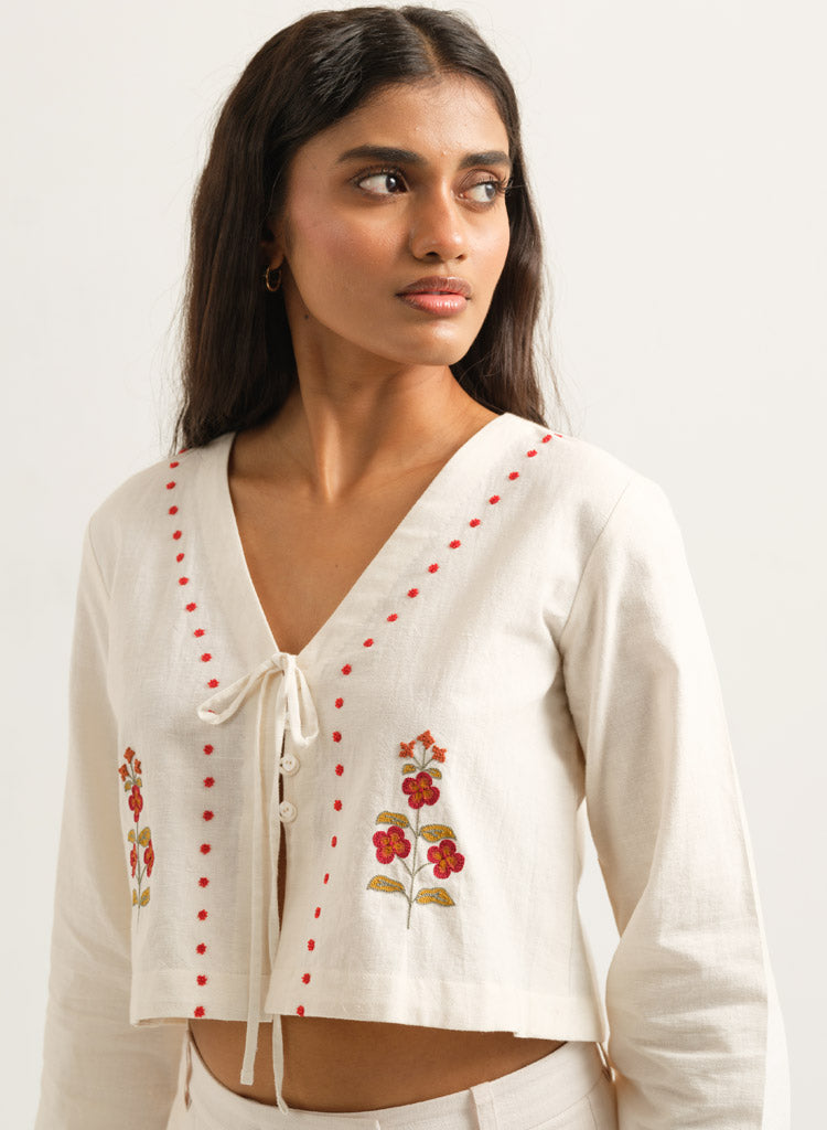 An oversized cropped top with a tie-up and loop buttons. Crafted with comfort and style in mind, it features delicate bead and hand embroidered details all through the front. Length 16". The model is 5'5" and is wearing size S.