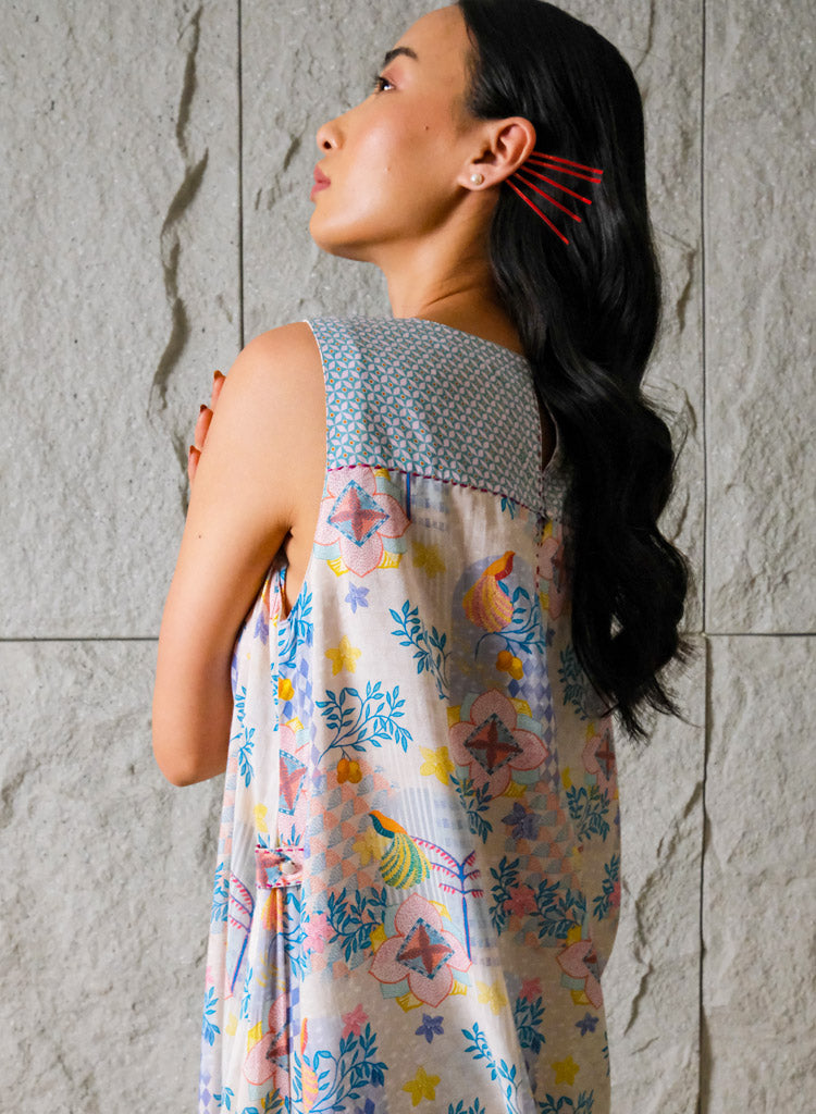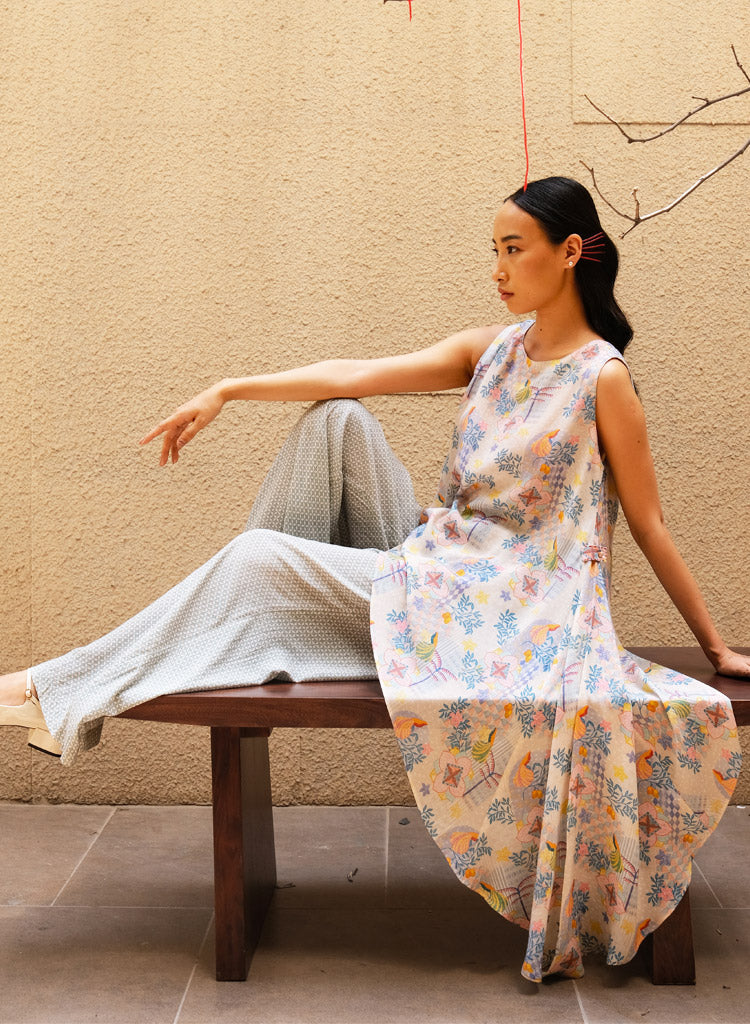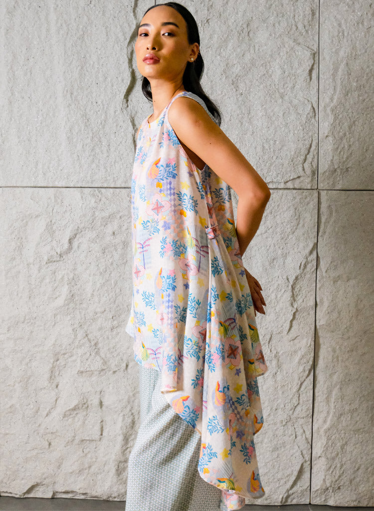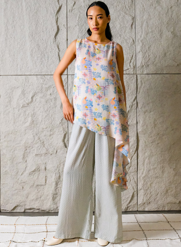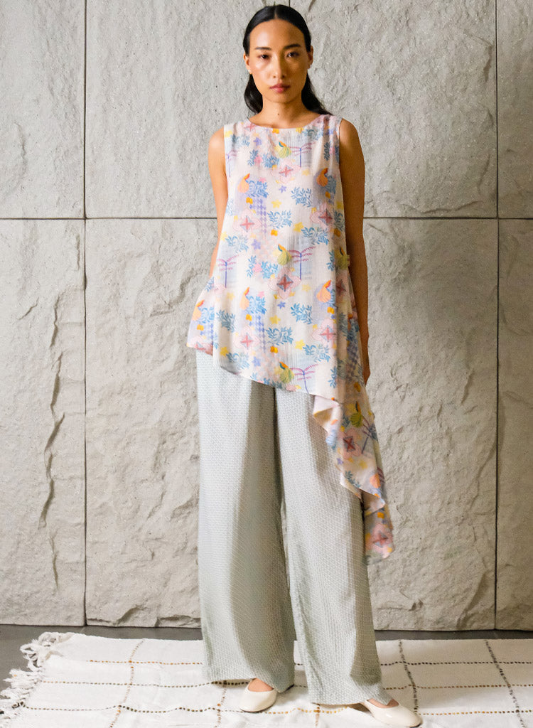 A two-piece set pairing Jolie Top and a wide leg trousers. The sleeveless top boasts a unique handkerchief hemline that cascades down with fluidity featuring a round neck. The wide trousers drape beautifully and feature an elasticated waist back for all-day comfort and ease of wear. The model is 5'7" and is wearing size XS.