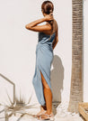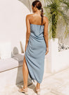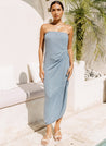 A hand draped tube dress with ruching detail featuring a side zipper. Length 44". The model is 5'8", and is wearing size S.