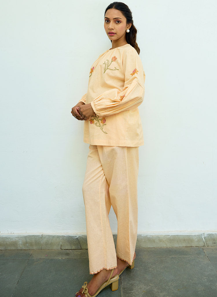 A two-piece set pairing the Judy Top and the Carly Pants. The round neck top with hand embroidered floral motifs features pleat detailing on the neckline and sleeve hem. Length 27". The straight-fit pants feature an embroidered scalloped hem and inseam pockets. Length 38". The model is 5'6" and is wearing a size S.