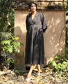 A fit and flare jamdani dress with statement pleated sleeves. Features an overlap yoke and shawl collar. Length 48". The model is 5'8", and is wearing size M.