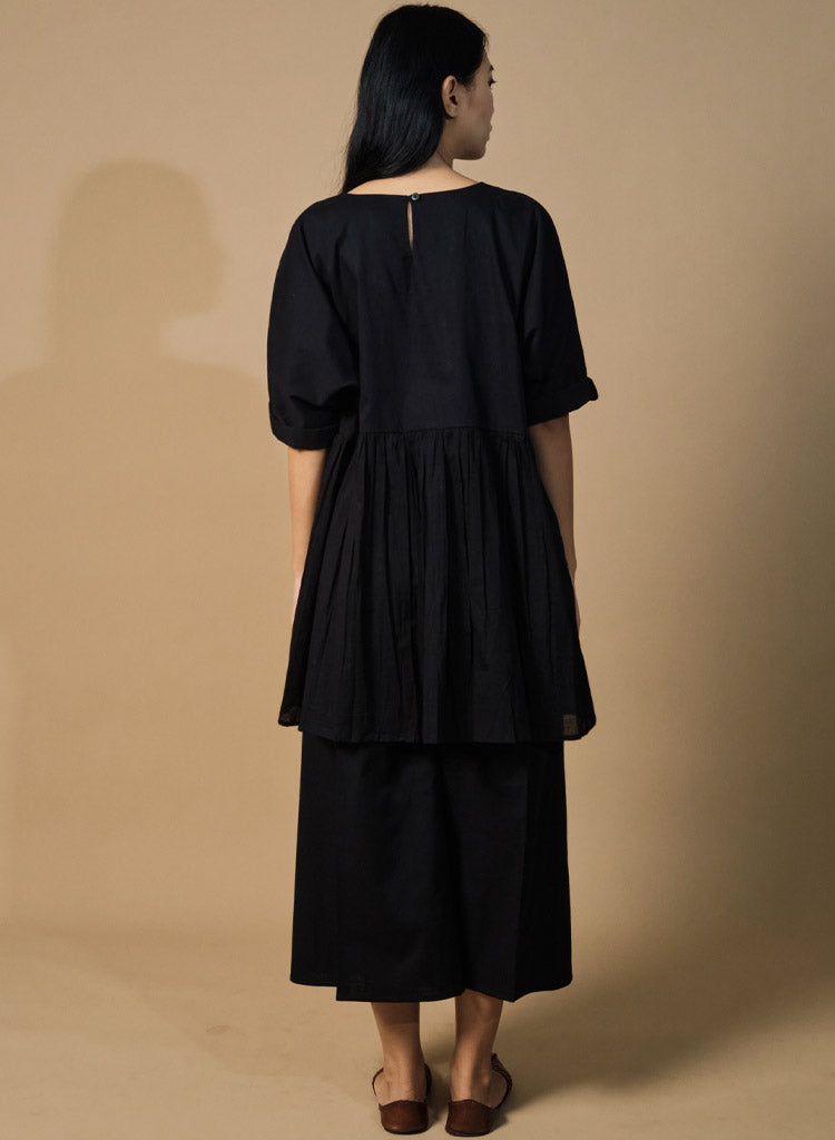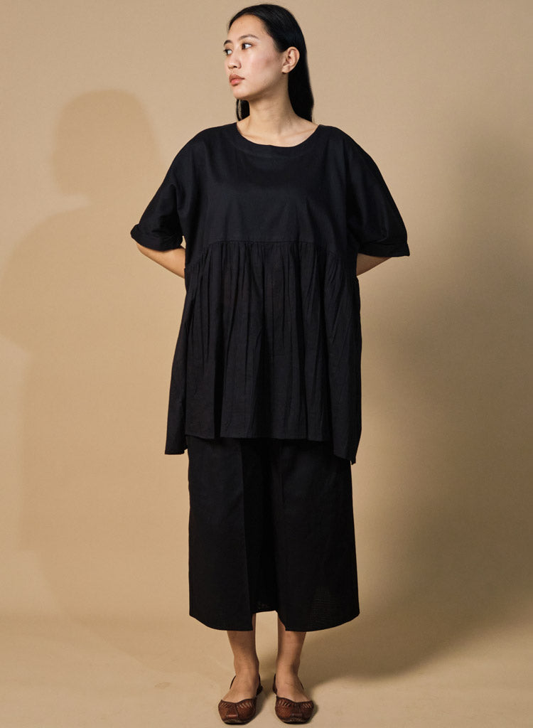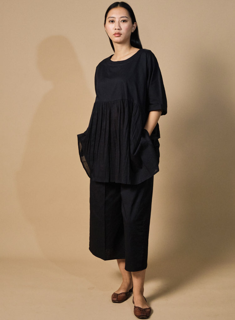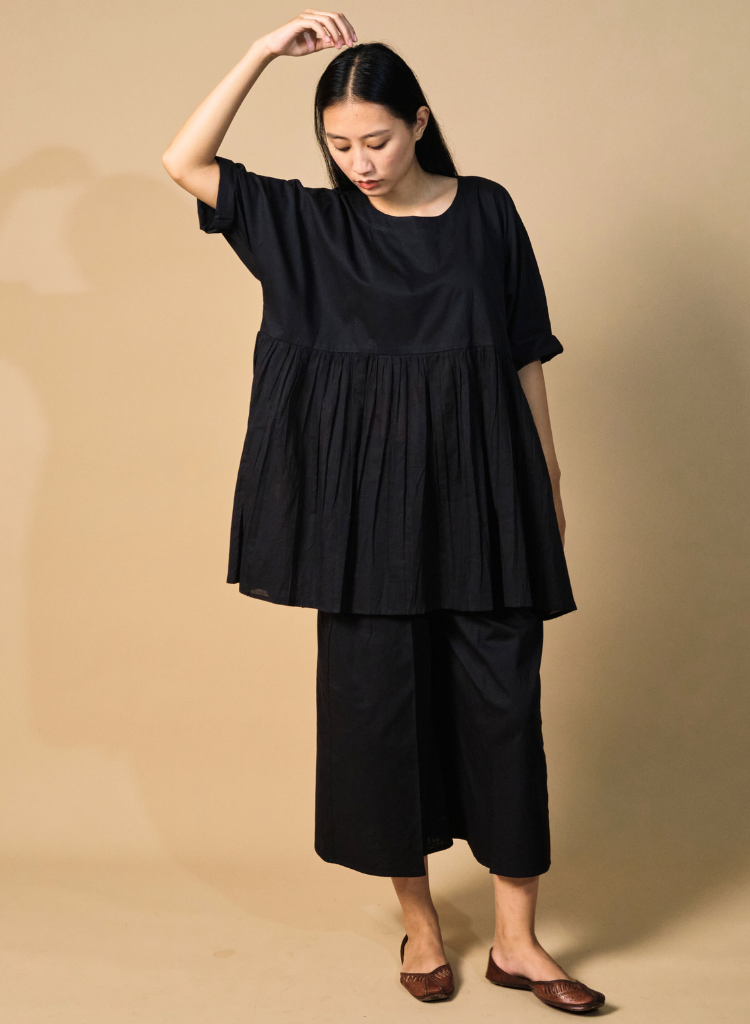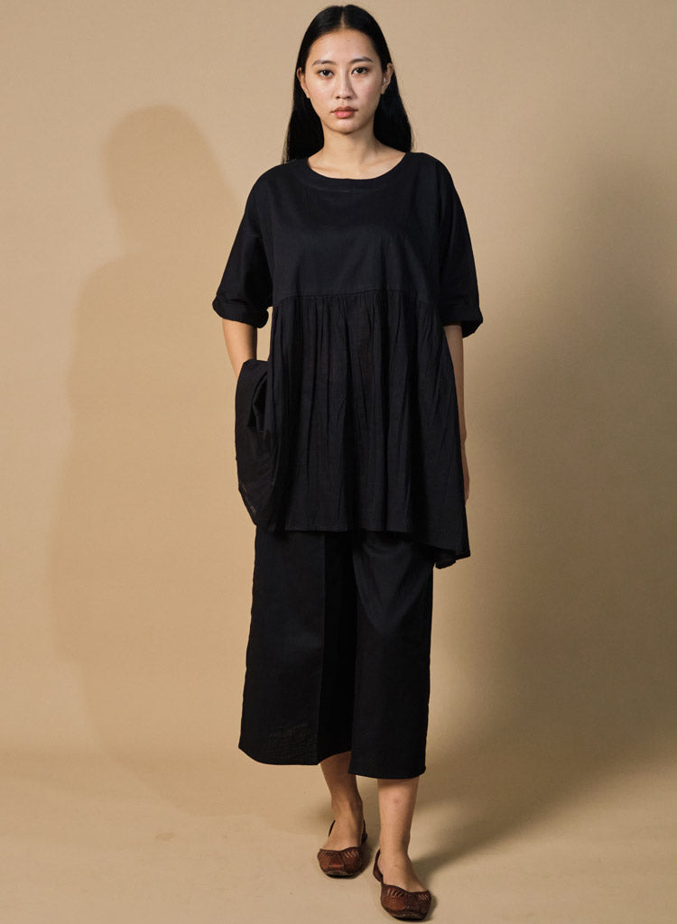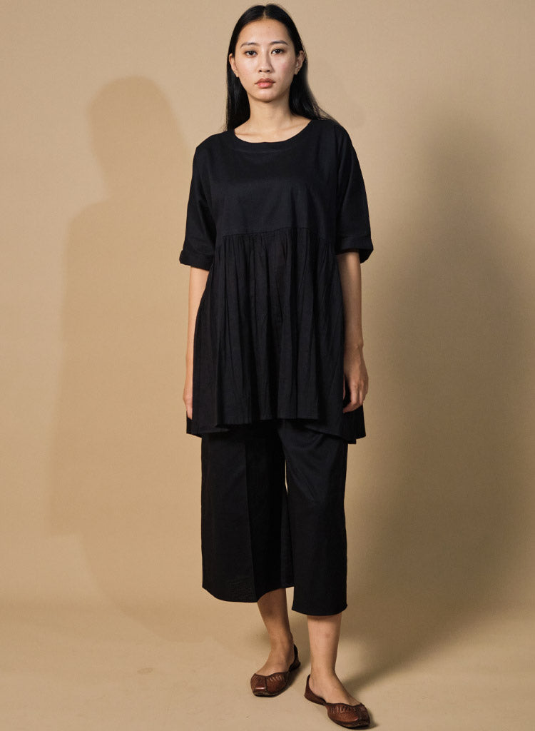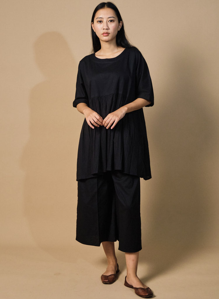 A two-piece set pairing a relaxing fitting and cropped pants. The relaxed fitting flared top features a round neck, 3/4 sleeves, and a back keyhole opening. Length 32". The wide-leg cropped pants feature an elasticated back waist belt and side pockets. Length 33". The model is 5'7" and is wearing size XS.