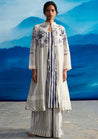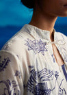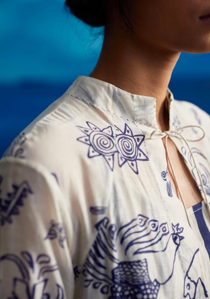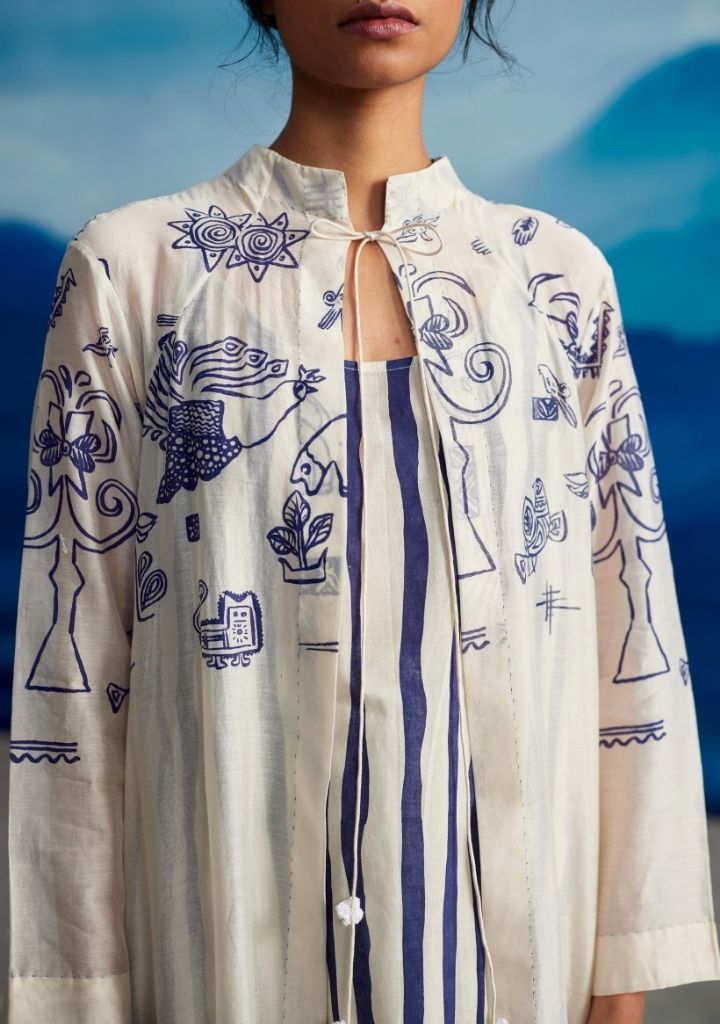 A two-piece set pairing an overlay and a slip. The hand screen printed overlay with lace and pleat details, front tie-up opening with handmade tussles and raglan sleeves feature long sleeves. Length 45". The printed slip features a wide neck and spaghetti straps. Length 44". The model is 5'8" and is wearing a size M.