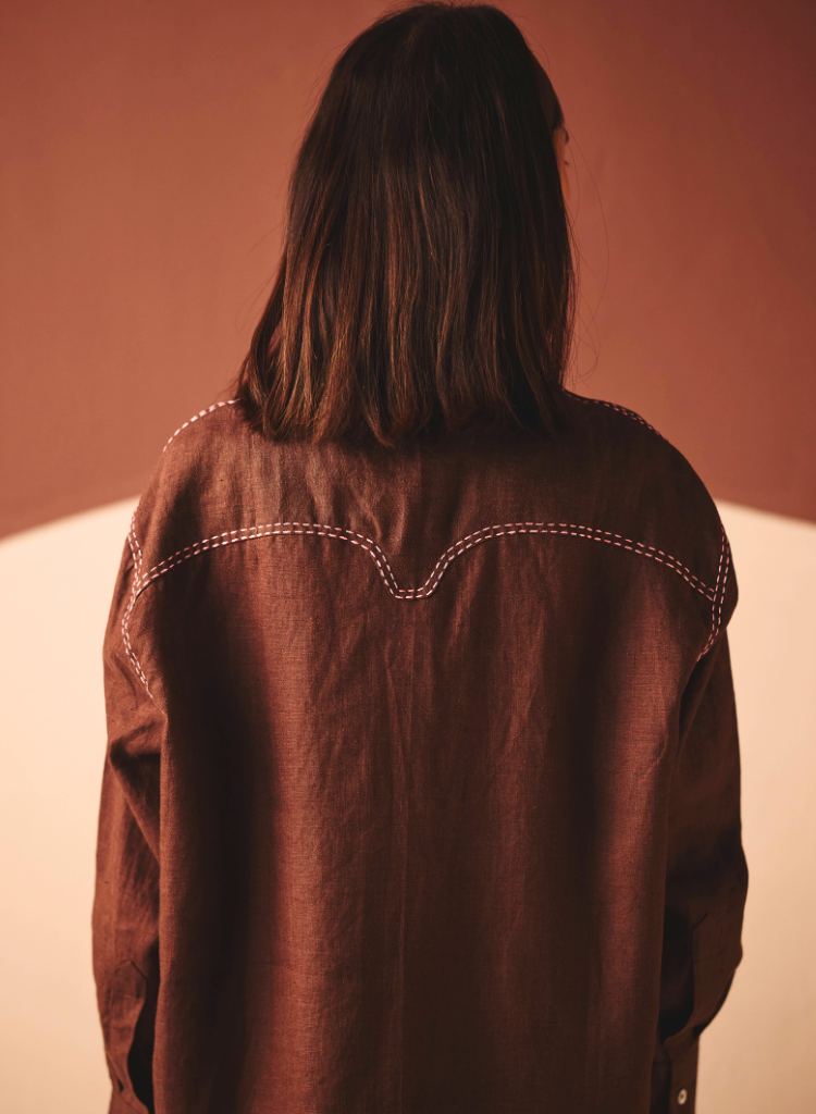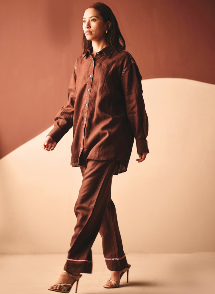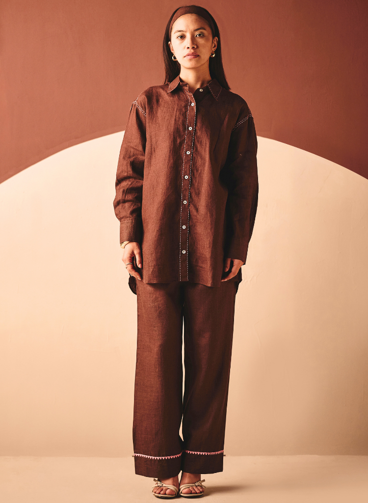 A shirt featuring a collar, front buttons and Kantha embroidery detail on front, sleeves & back yoke. Length 30". The model is 5'9” and is wearing size S.