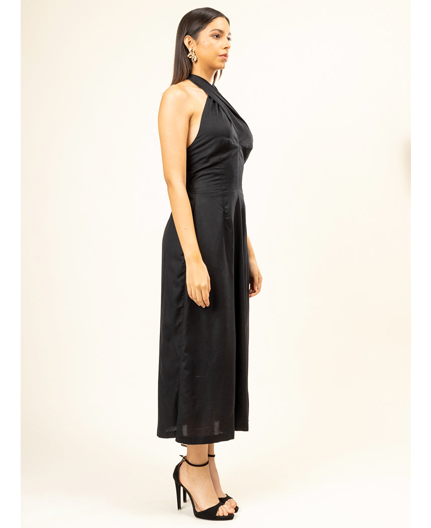 A classic midi dress with tie-up halter neck flaps featuring an elasticated back. Length 51". The model is 5'7" and is wearing size S.