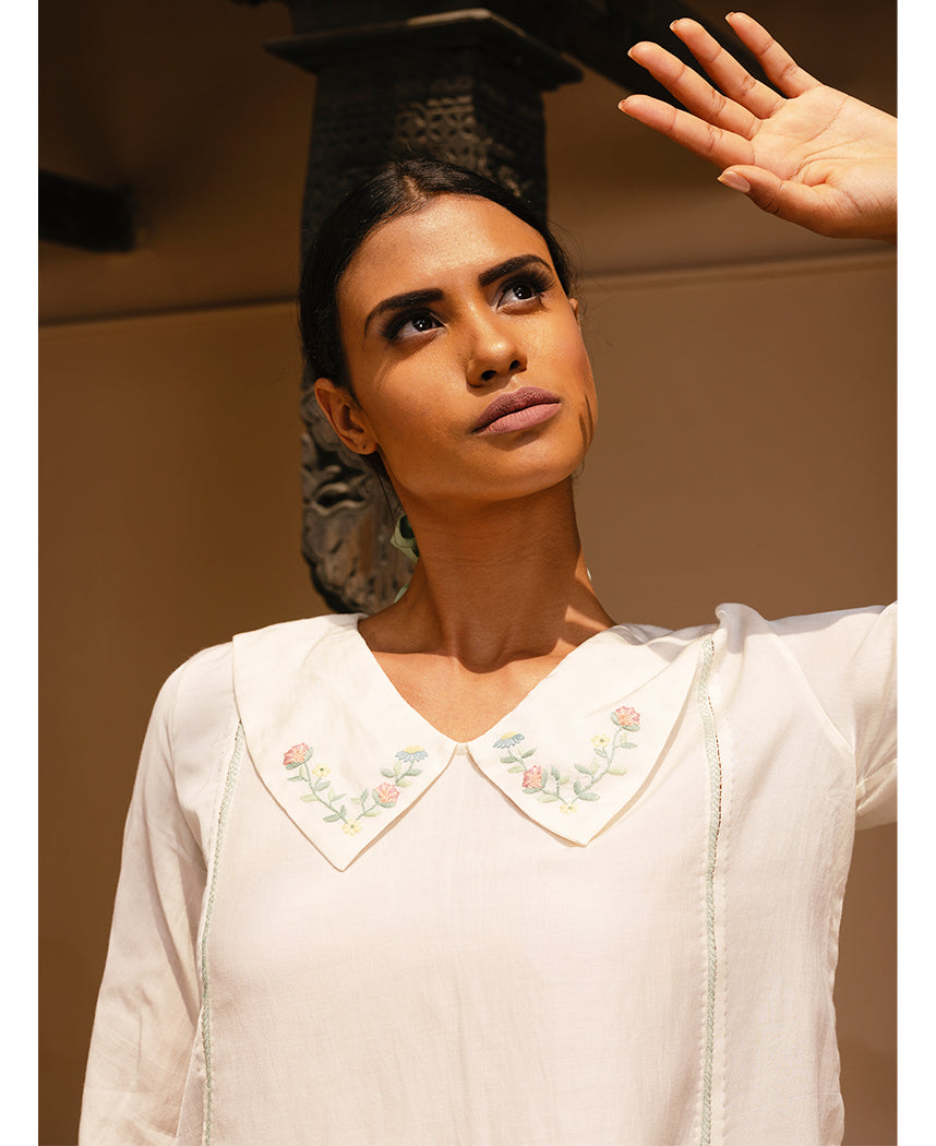 A two-piece set pairing the Kate Top and Sara Pants. The A-line top features hand-embroidered flowers on a Peter Pan collar, elasticated cuffs, and ladder embroidery at the front and back seams. Length 26". Made in 100% organic soybean fiber cotton. The fold hem pants feature pleat details, a front zipper, an elasticated back, and inseam pockets. Length 35". Made in 100% cotton. The model is wearing size S.